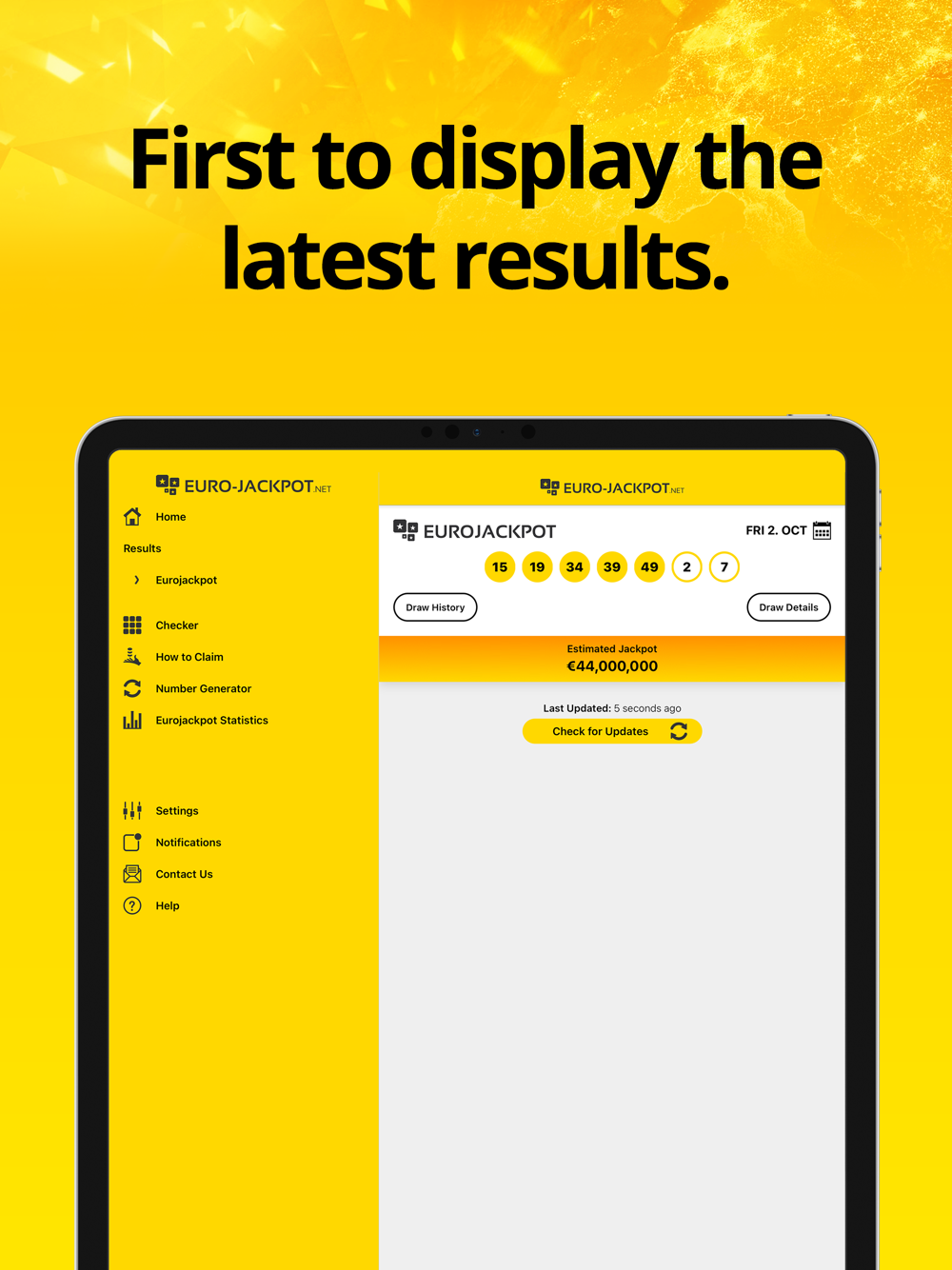 Get the latest Eurojackpot results within seconds of the draw taking place. This easy to use app shows the Eurojackpot numbers (including associated draws like Joker) and full prize breakdowns including number of winners and prizes paid.