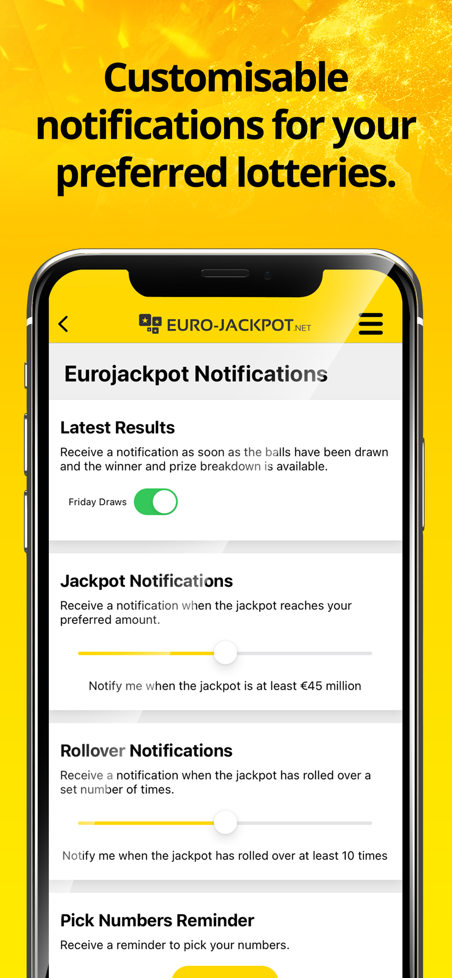 Get notified instantly when the latest Eurojackpot results and prize breakdowns become available. Want to know when the jackpot has rolled over or has reached a certain amount? Just head to the Notification section of the app to set up your alerts. There is also the option to set notifications at times that suit you - great for reminding you to purchase tickets before the draw.