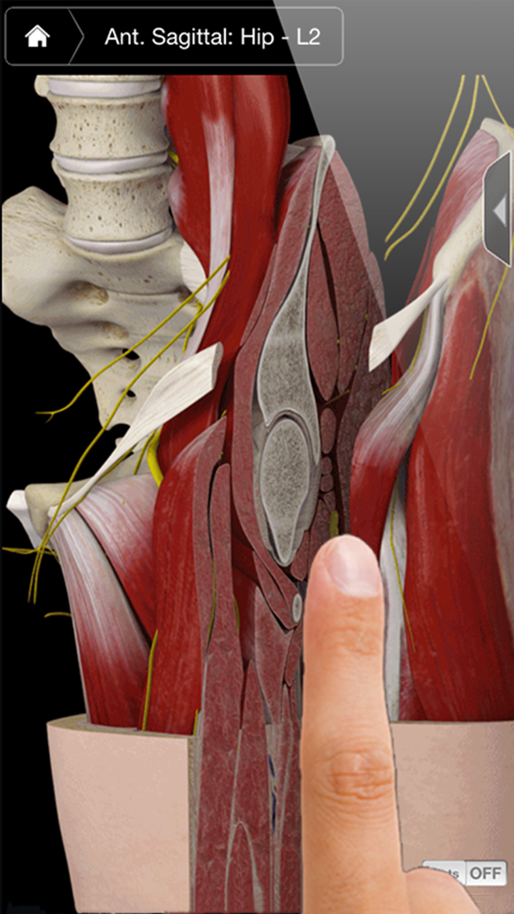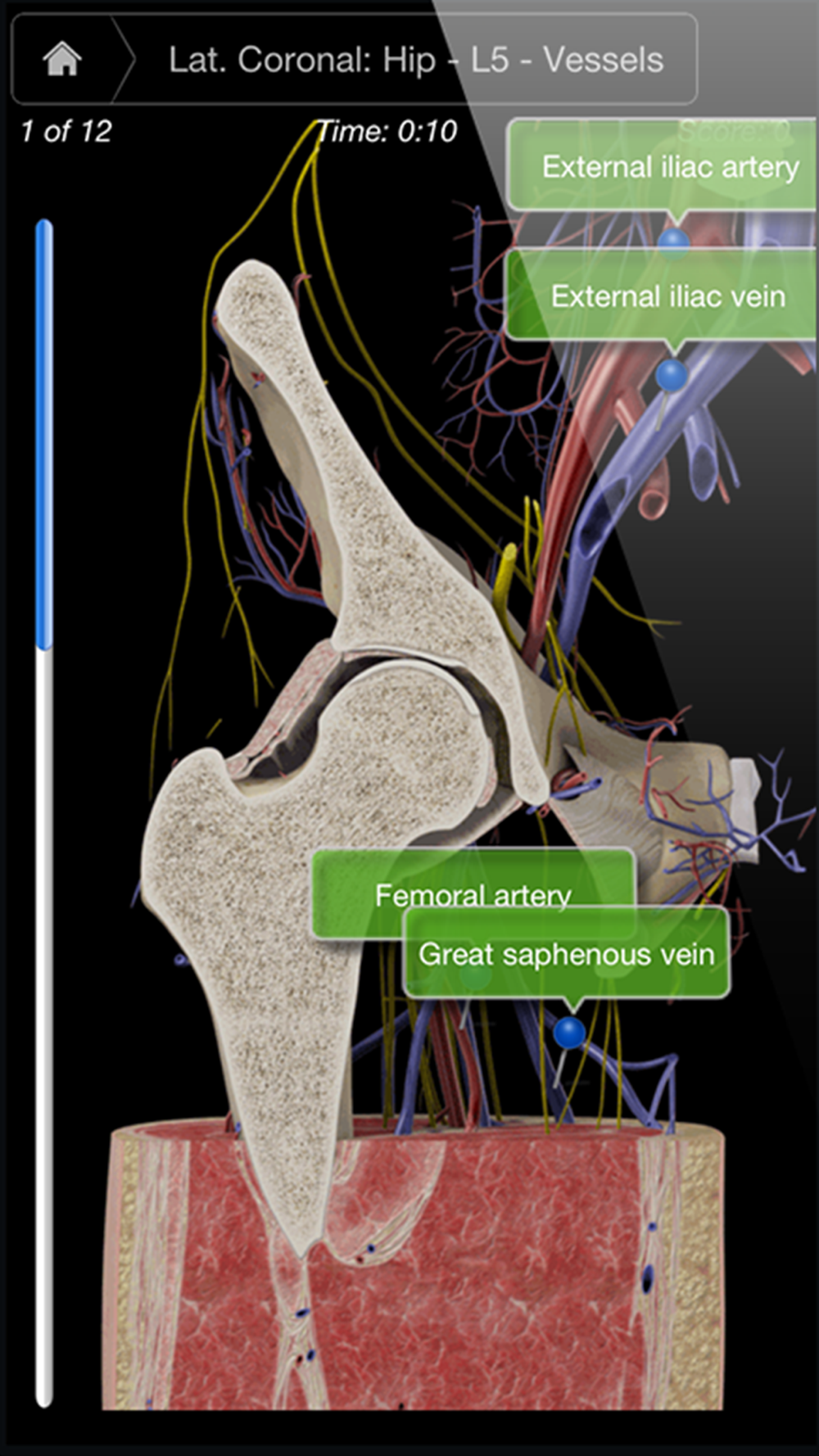Hip Pro III gives users an in depth look at the hip, allowing them to cut, zoom & rotate the Hip. Hip Pro III provides multiple cross sections (Sagittal, Coronal and Transverse) as well as the ability to cut away different layers revealing the muscles, blood vessels, nerves and connective tissue down to the skeleton.