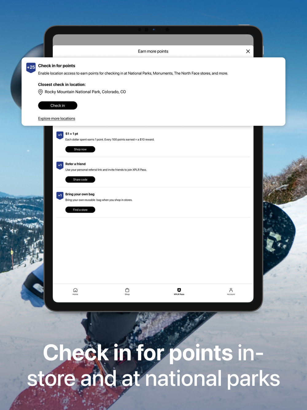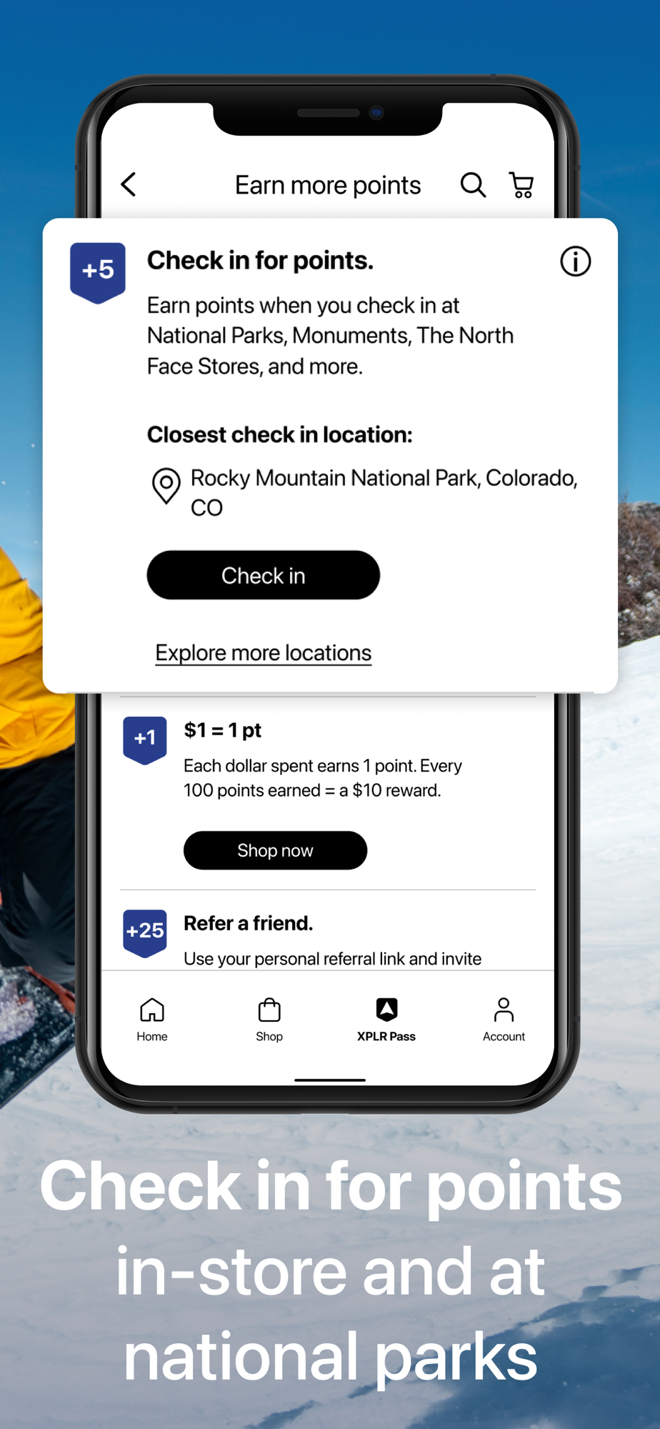 • Use our iOS mobile app to check in at National Parks and Monuments and The North Face stores and outlets and earn 5 points.