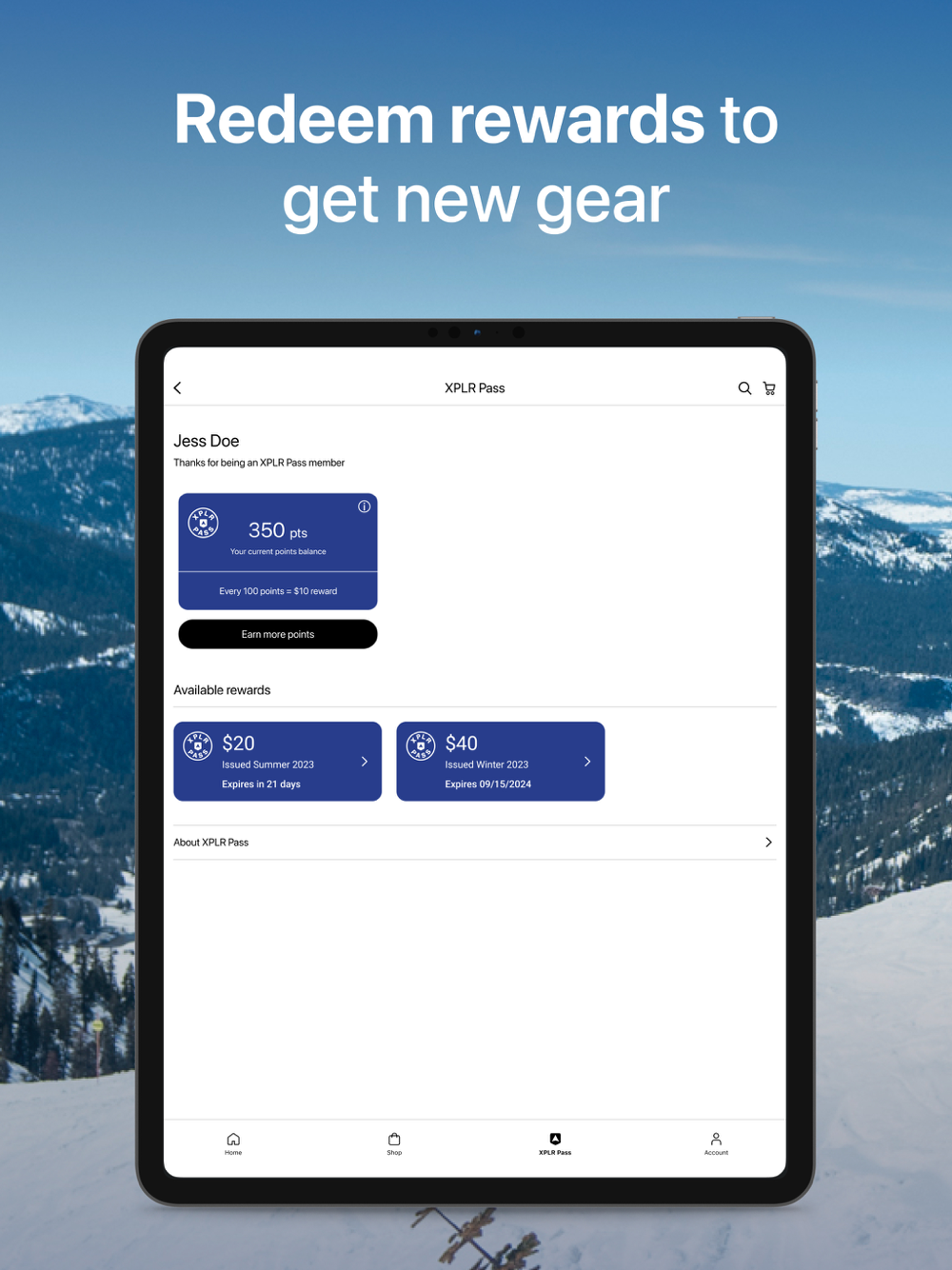• Every $100 spent (100 points earned) gets you a $10 reward toward gear for your next adventure.