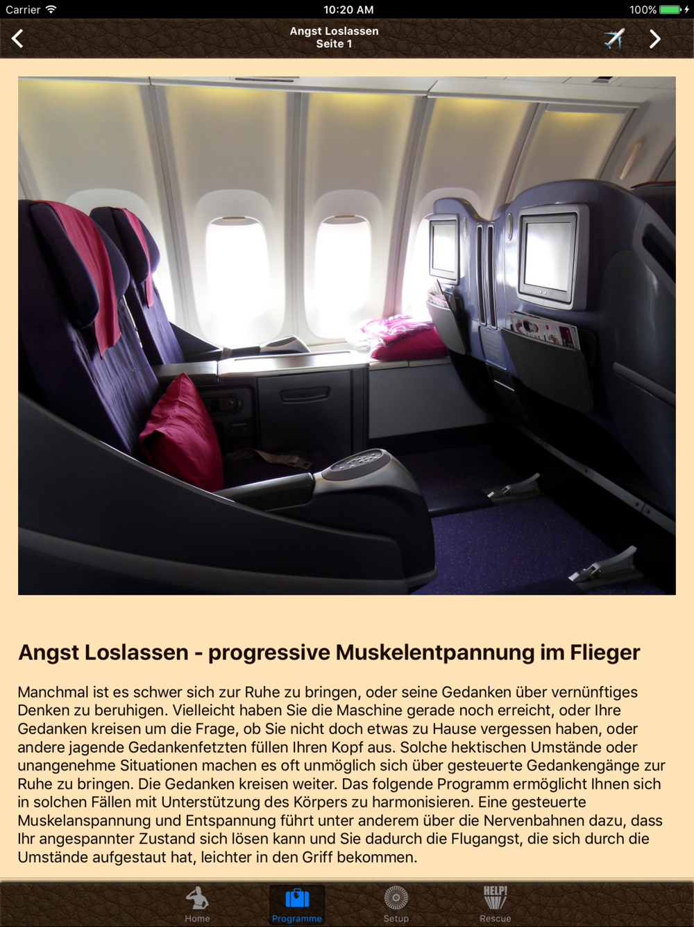 Zusätzlich zu den verhaltenstechnischen und psychologischen Programmen wie Autogenes Training, Muskelrelaxionsübungen, NLP-Programmierung, Klopfübungen, Yoga Nidra und vieles mehr erhalten Sie jede Menge an Informationen, die Ihnen helfen das Fliegen realitätsbezogen zu beurteilen. Sie räumen auf mit den ganzen angsterzeugenden Filmen, Dokus und Nachrichtenkommentaren, mit denen wir laufend gefüttert werden.