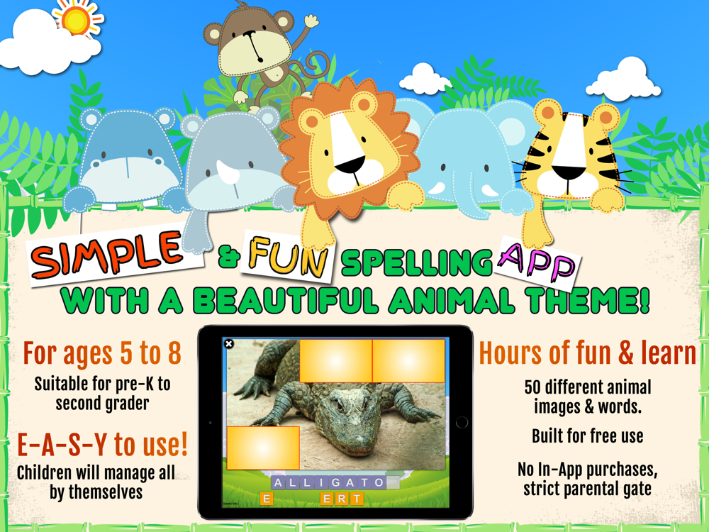 Guess & Spell: Animals is an animal themed app for kids learning spelling. The app has a simple and fun gameplay and a scalable hint system to make the use easy or challenging enough for kids just starting their spelling or advanced readers. This LITE version has 50 images and words, and is free to use forever.