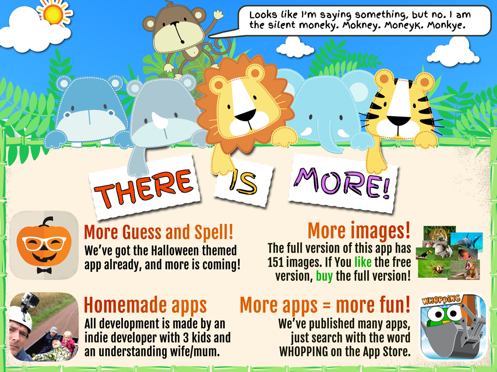 The Whopping Apps family has over a million downloads already since 2011. Guess and Spell: Animals is the latest addition into the selection, released in October 2015. Guess and Spell: Halloween was the first of the series, released in September 2015.