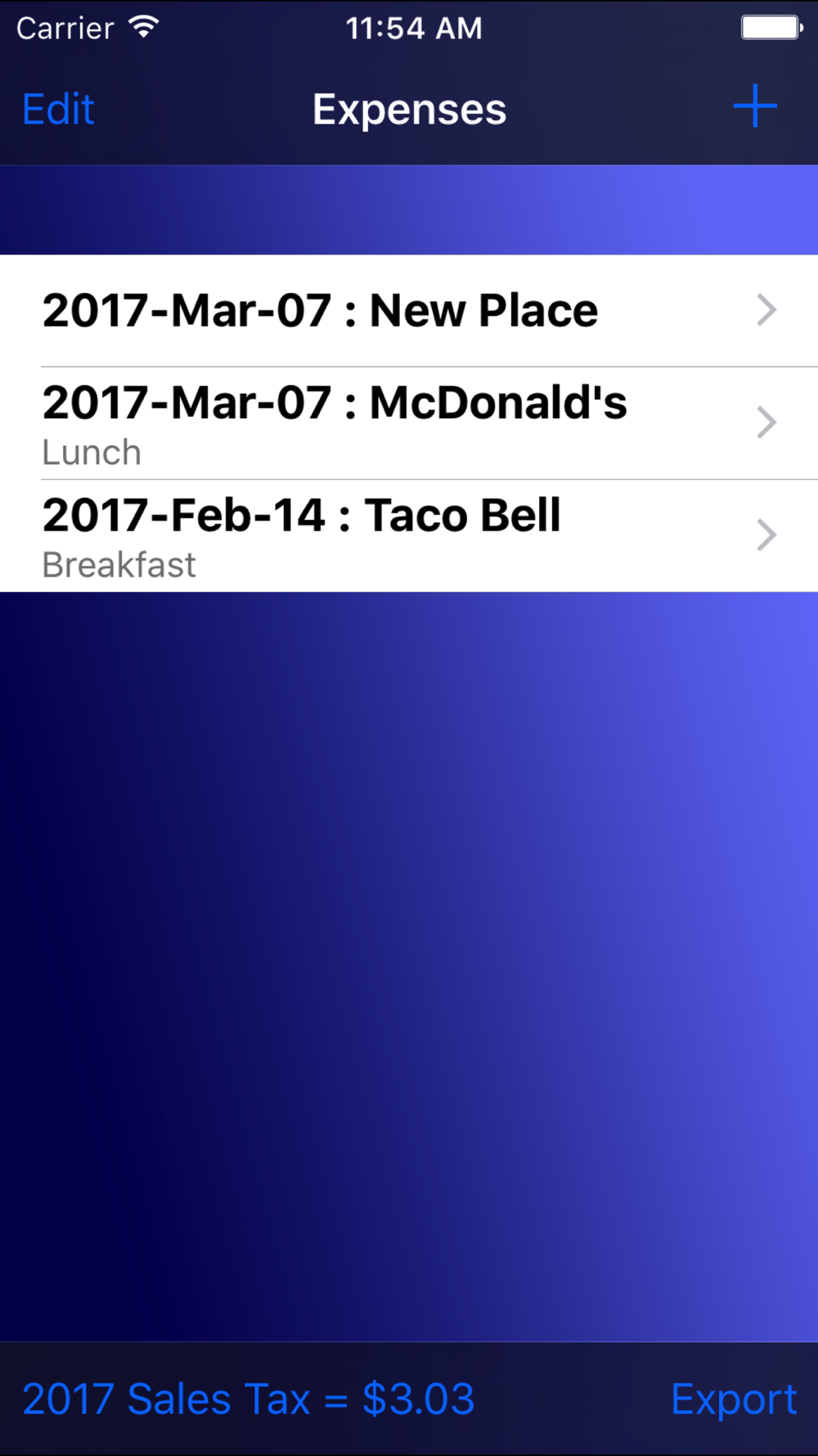 Provides a method to store receipts for sales tax purposes... Can also be used to track expenses. Tap the text on the bottom bar, and the summary will tab through each year sales tax exists.