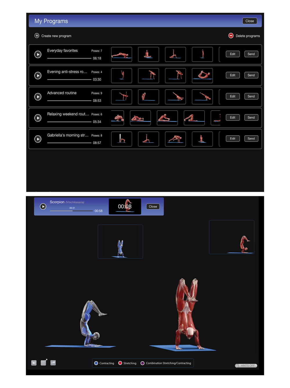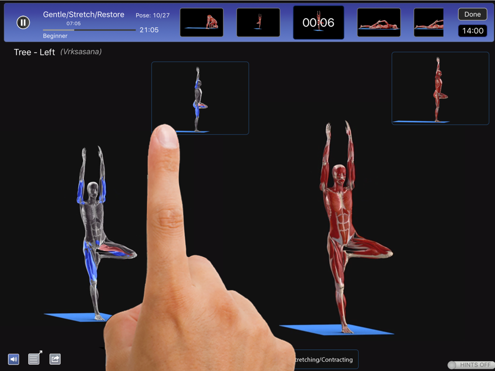 • Isolated muscle view shows muscles relevant to each pose as they flex and stretch.