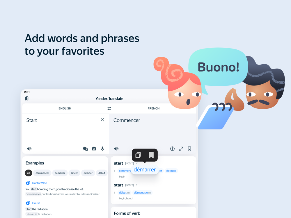 • Learn new words and their meanings through usage examples in the app’s dictionary (available for most of the currently supported languages).