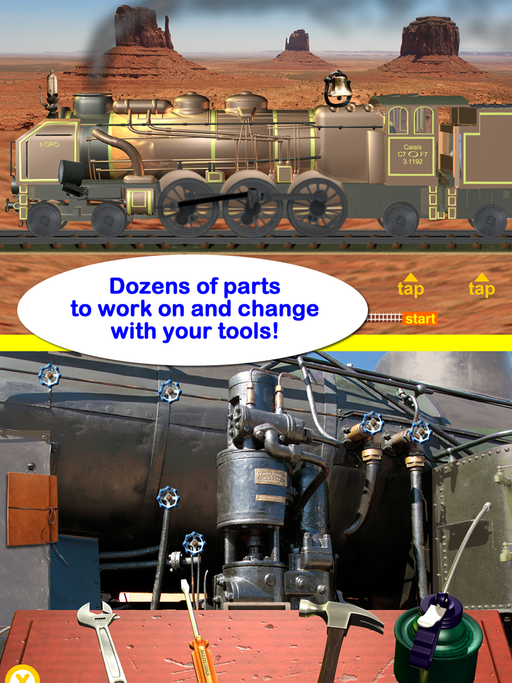 *Work on dozens of parts in your train with your wrench, screwdriver, hammer and oil can! Change out knobs for your firebox, and replace gauges, lamps, and the various parts of your air brake system!