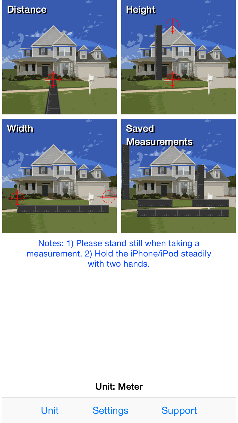 Three types of measurements can be done with Measure Tape - height and width of an object, and a distance between an object and you.