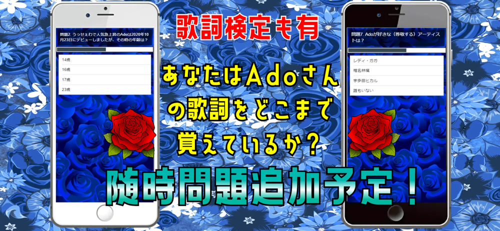 大人気女性歌手「ado(アド)」にあ関するクイズアプリです。