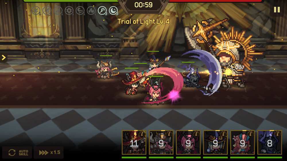 Create your own unique 'Battle Deck Strategy' and customize it to your liking! If you and your pixel knight want to grow even stronger, combine characters from the same position. You can even double or triple the skill effects by doing so!
