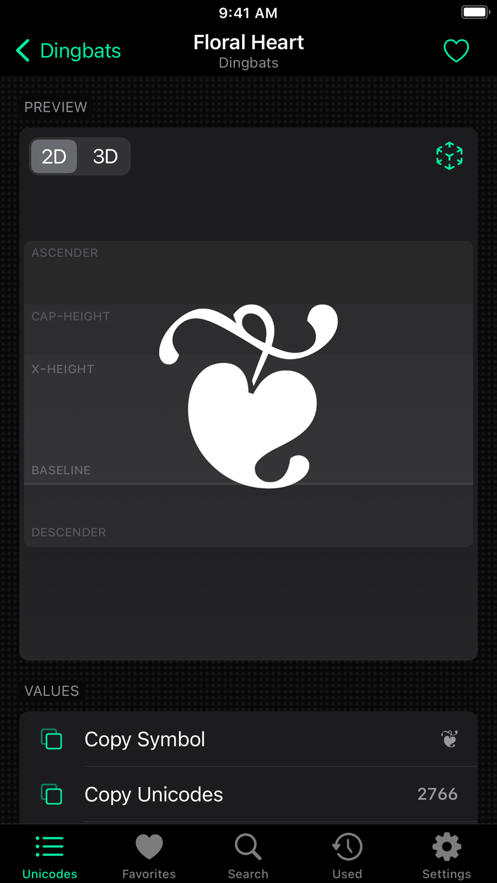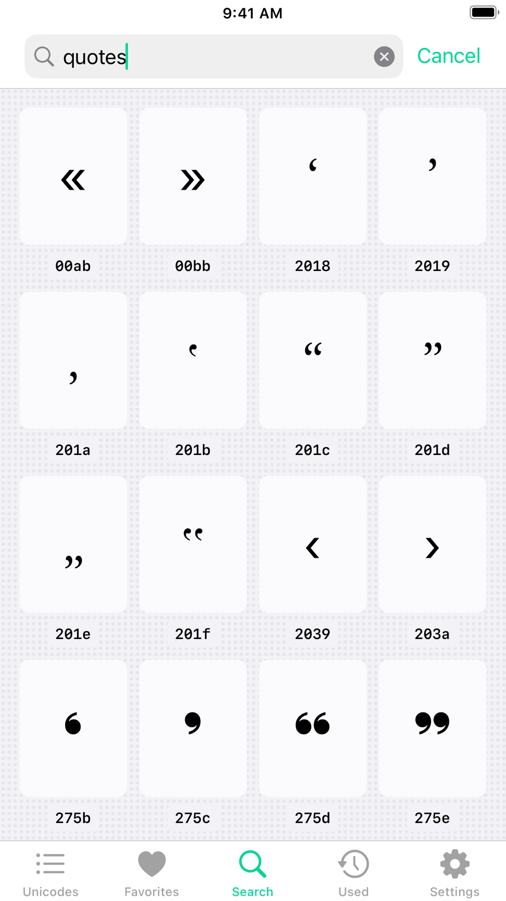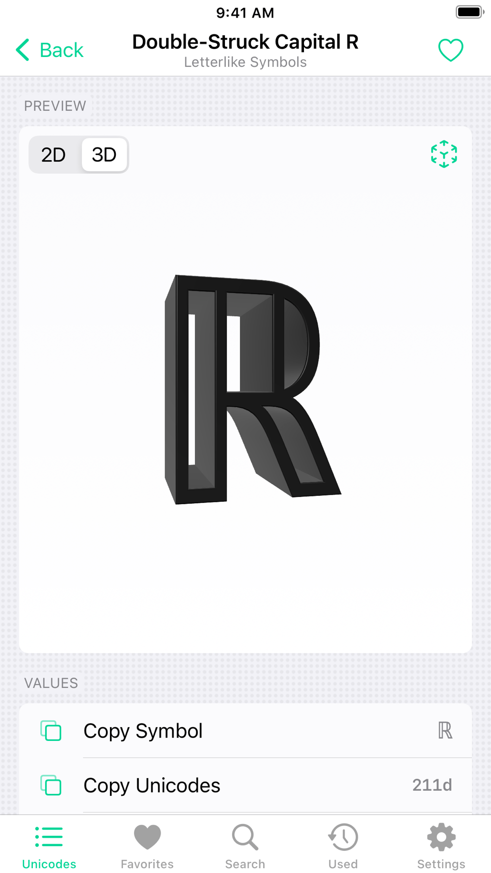 70,000+ Unicodes in your pocket! Codepoint helps you find glyphs, icons and symbols. Search for Unicodes, characters, emojis or SF Symbols. Export them to different formats like Hex, Decimal, UTF, HTML or Swift code. Quickly convert them into 3D models for your next AR/VR project. Mark your favorites and access them on all your devices thanks to iCloud sync. Frequently used Unicodes are remembered automatically by Codepoint. Hand-picked glyphs are also accompanied by typographic hints that explain how to use them correctly.
