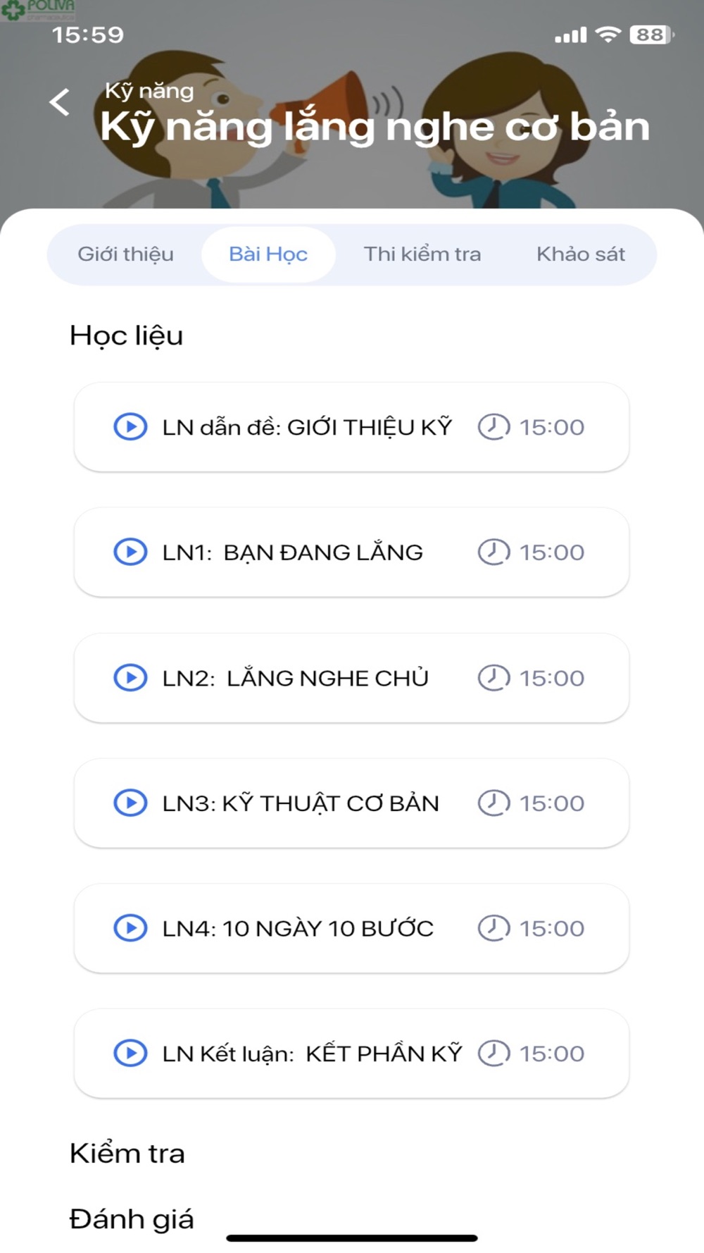 - Quản lý khóa học của tôi: Xem danh sách các khóa học của học viên, tham gia học, làm bài thi, làm khảo sát đối với khóa học đang tham gia