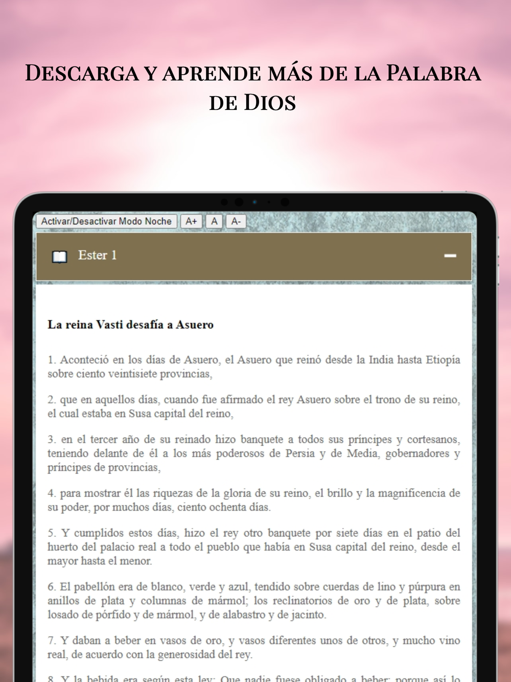 Dentro de Estudios Bíblicos para Mujeres encontrarás recursos bíblicos tan interesantes como un Diccionario Teológico con gran cantidad de definiciones y términos teológicos explicados y ordenados para su fácil compresión, Devocionales para la mujer en audio, Temas Bíblicos de la A a la Z , Matinal para Damas y una Biblia offline Reina Valera 1960 completa escrita para leer cualquier capítulo que desee en cualquier momento o lugar.