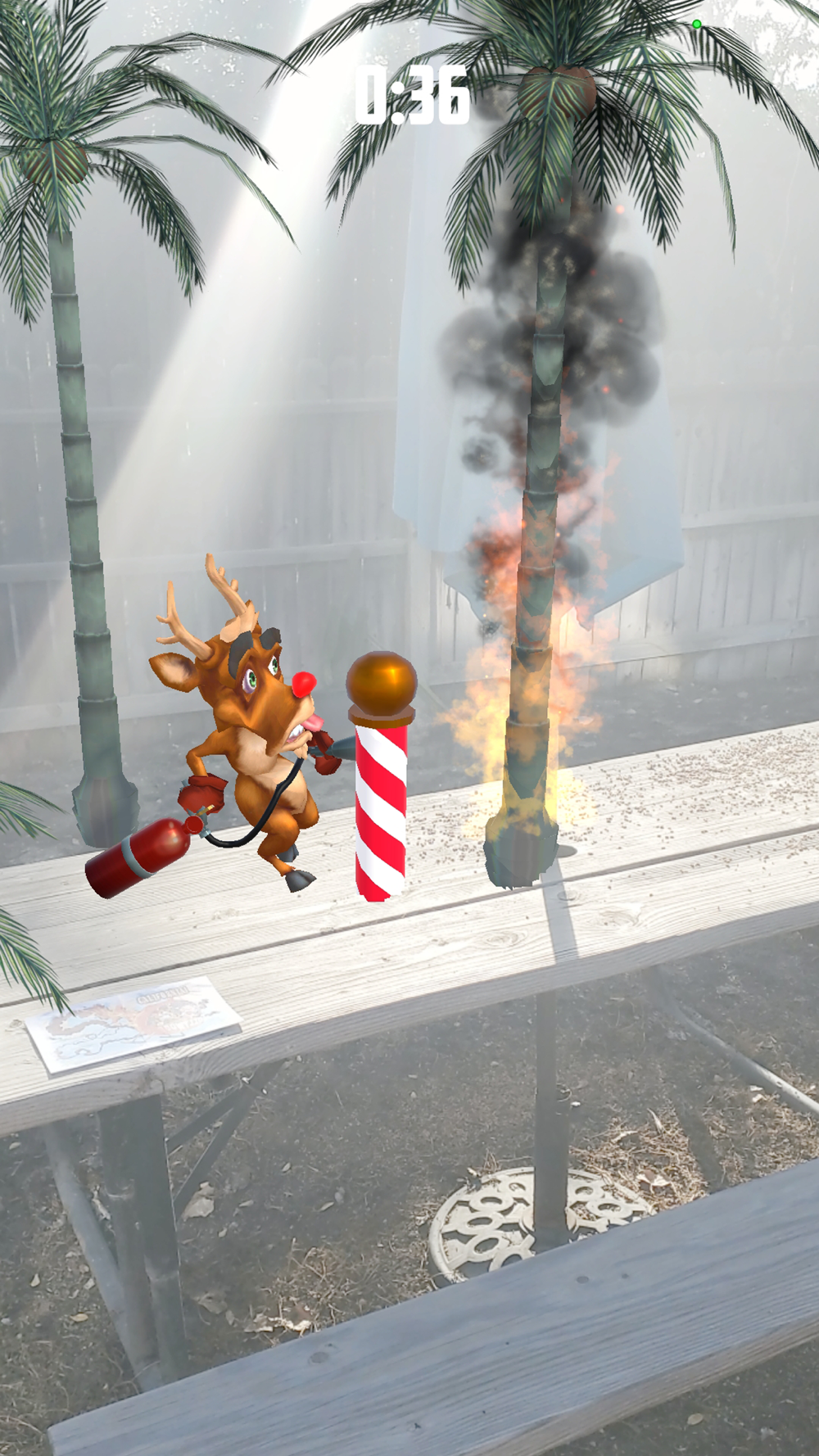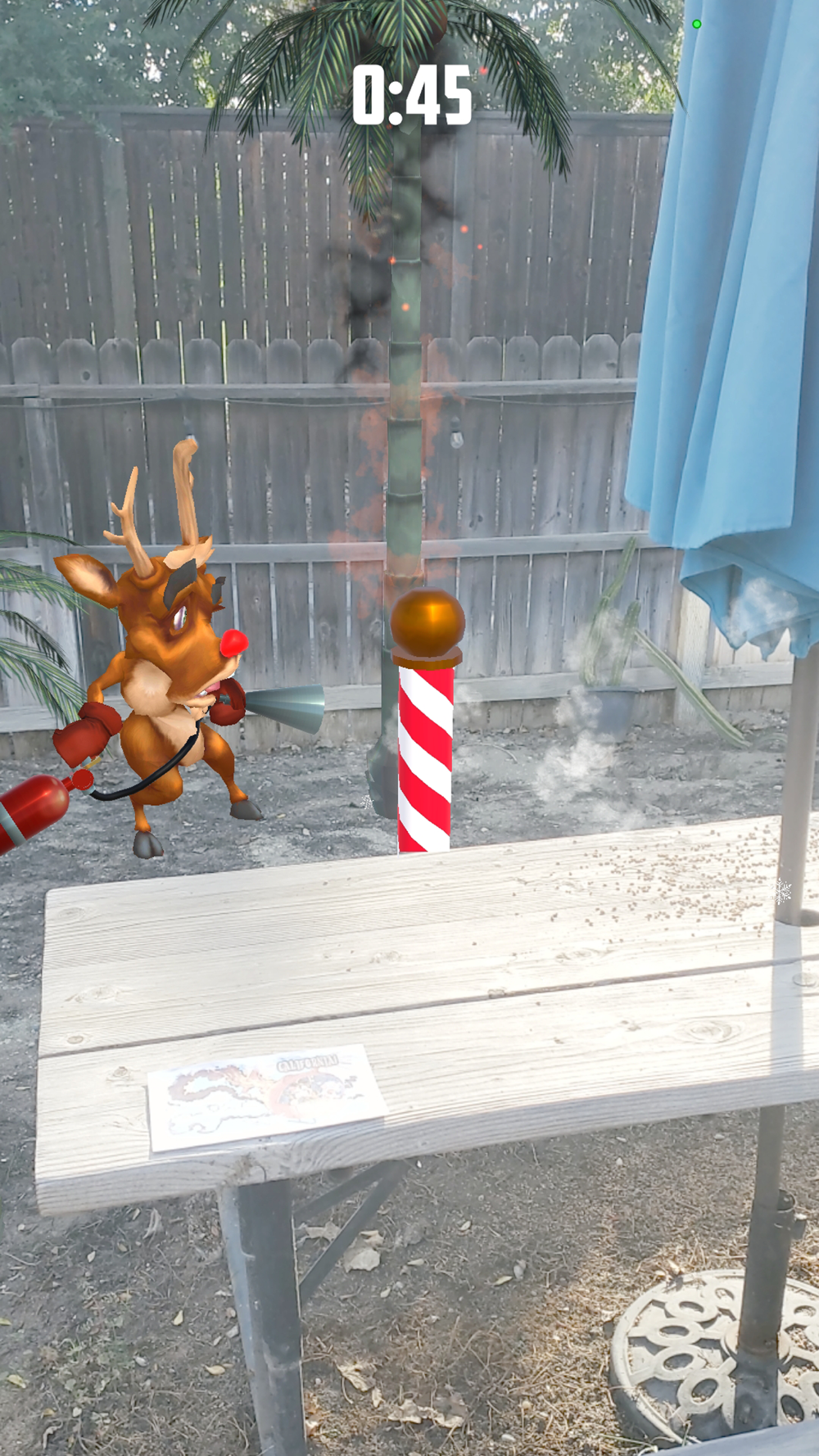 Help Rudolph put out flaming AR palm trees in your room to save Christmas. Scan the card to start the game, look for palm trees on flat surfaces in your room, tap the trees to lead Rudolph to them and have him put them out. Have fun. In order for the app to work you must have a printed copy of HawaiiAR's latest Christmas card.