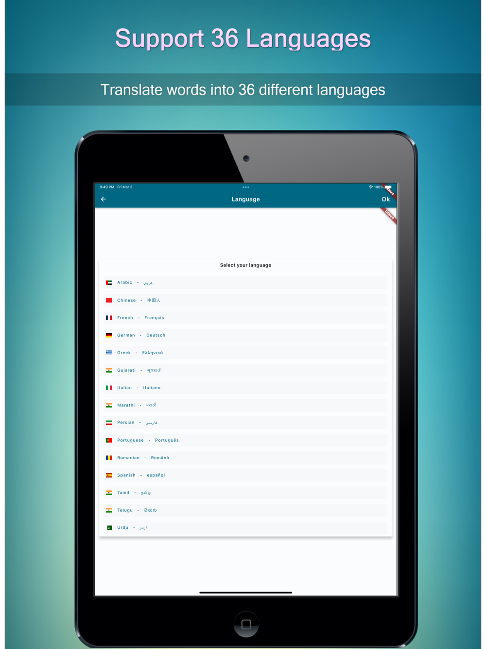 This app is available in 36 languages including Spanish, Portuguese, Turkish, French, Chinese, Punjabi, Vietnamese, Urdu, Japanese, Marathi, Telugu, Korean, Tamil, German, Arabic, Italian, Gujarati, Persian, Ukrainian, Polish, Romanian, Dutch, Greek, Hungarian, Swedish, Czech, Bulgarian, Croatian, Danish, Finnish, Norwegian, Slovak, Catalan, Lithuanian, Hindi and Bengali.