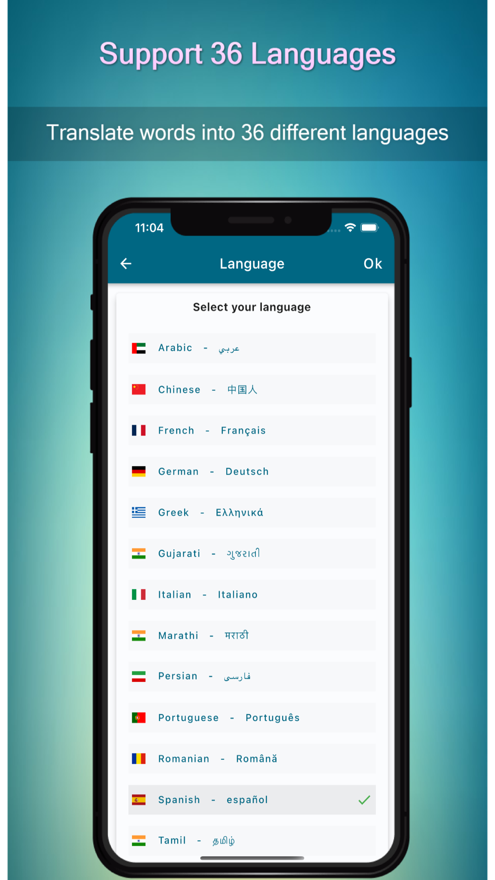 This application supports 36 languages, with features such as phonetics, pronunciation, correct pronunciation, and sample sentences to help you progress in learning English vocabulary.