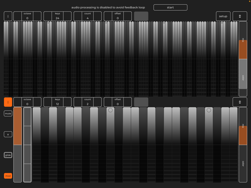 It contains two sets of resonators controlled by separate keyboards. Each resonator has independent pitch (set by EDO division value of the keyboard), volume and modulation.