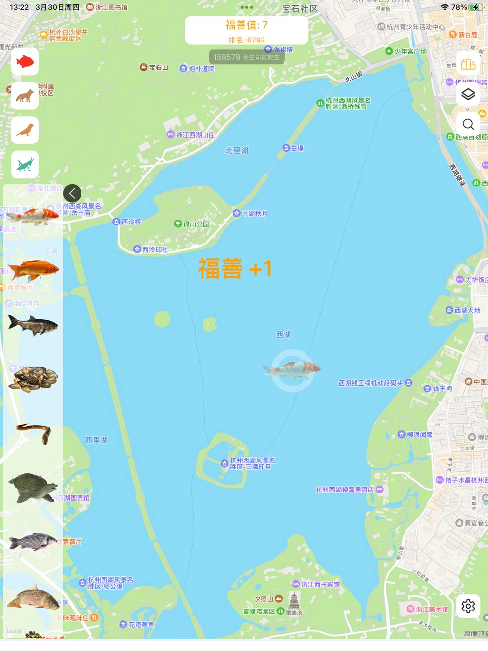 搜索需要放生的地方,选择鱼类、鸟类、兽类、昆虫类,长按拖动到地图上,松开手指即可实现放生,还会有音效,落水声、动物的叫声。
