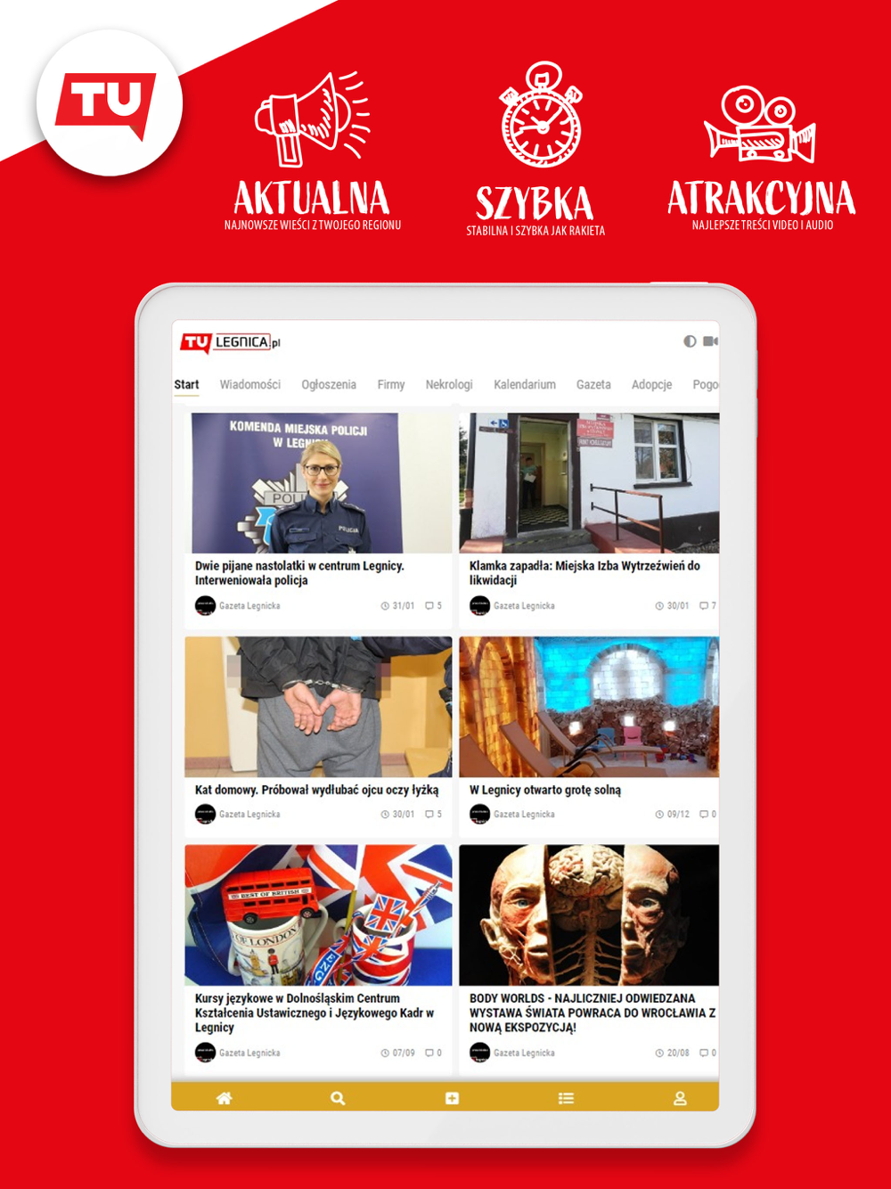 Najnowsze wiadomości, sprawy dotyczące Legnicy i powiatu legnickiego. Sport, biznes, aktualności samorządowe i informacje policyjne. Wydarzenia kulturalne, relacje fotograficzne i video. Tematy ciekawe i rozrywkowe oraz te poważne i bulwersujące. To wszystko znajdziesz w jednym miejscu w naszej aplikacji! Sprawdź, co dzieje się w Twojej okolicy i bądź zawsze na bieżąco!