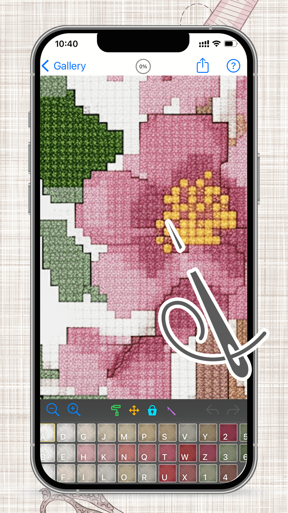 Select the color and tap to place stitches, paint by number, it is simple, relaxing and fun.