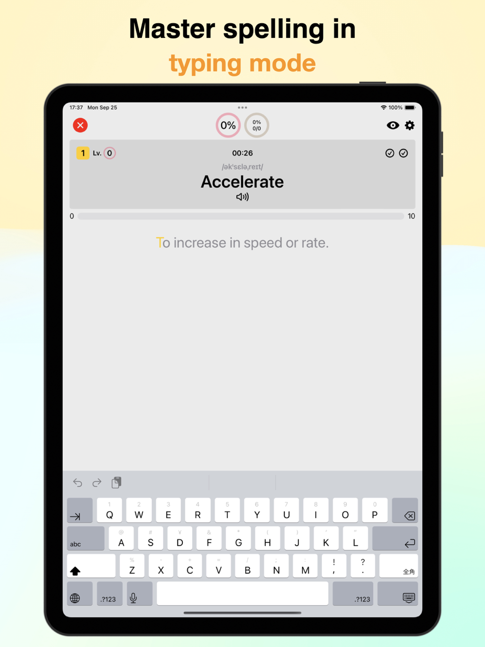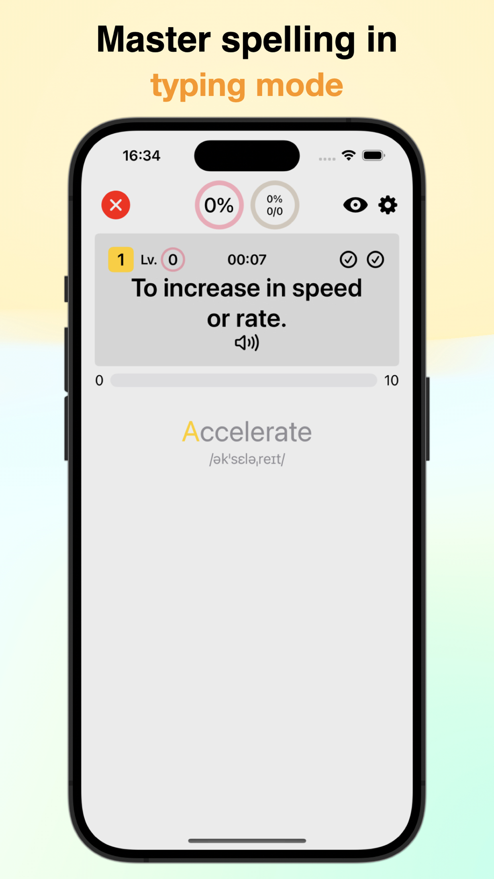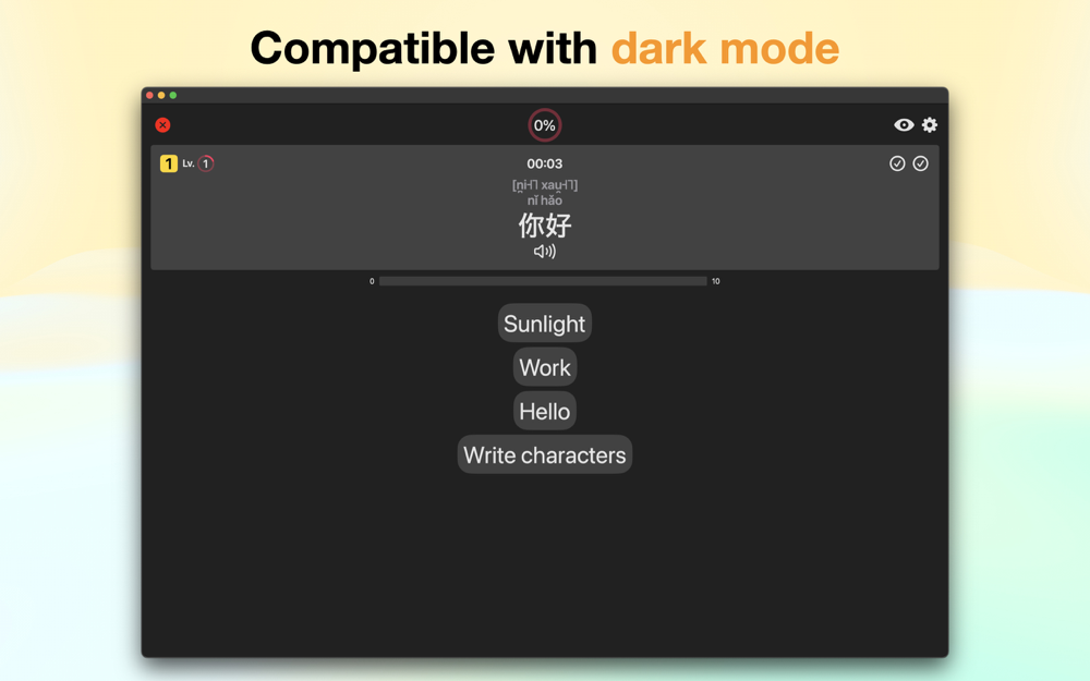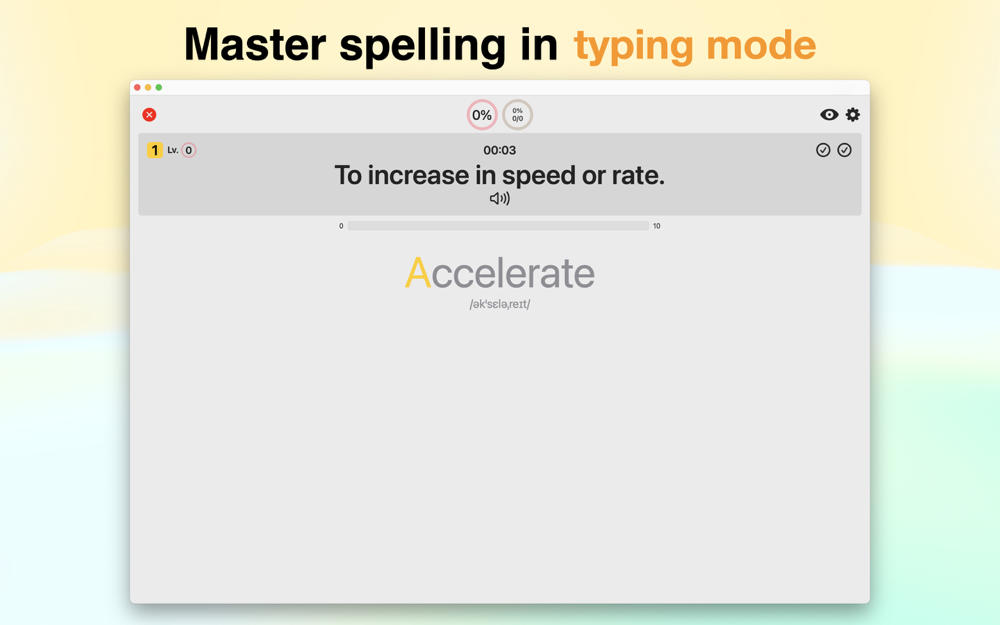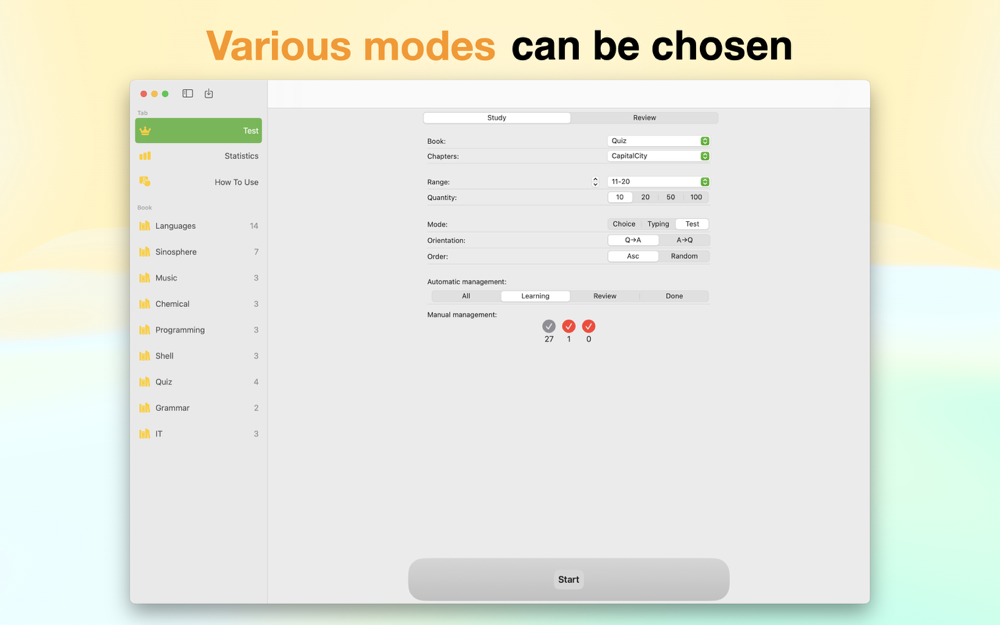 There are three modes: Choice Mode, Typing Mode, and Test Mode. You can change them according to your learning progress and preferences.