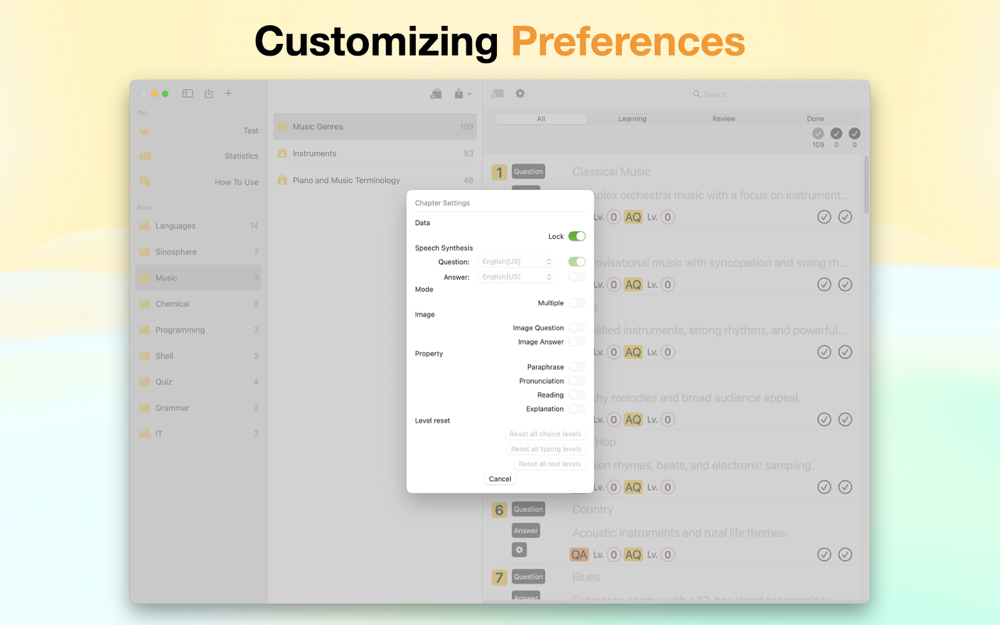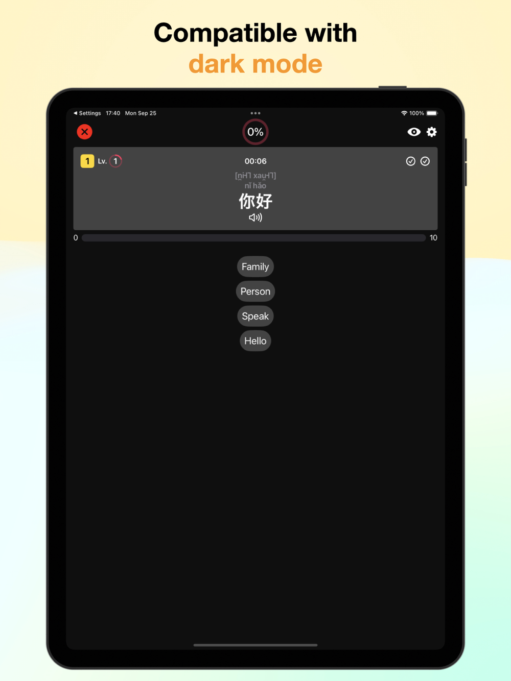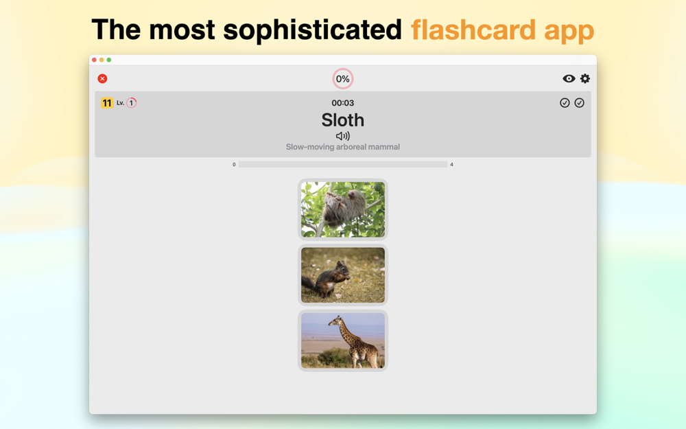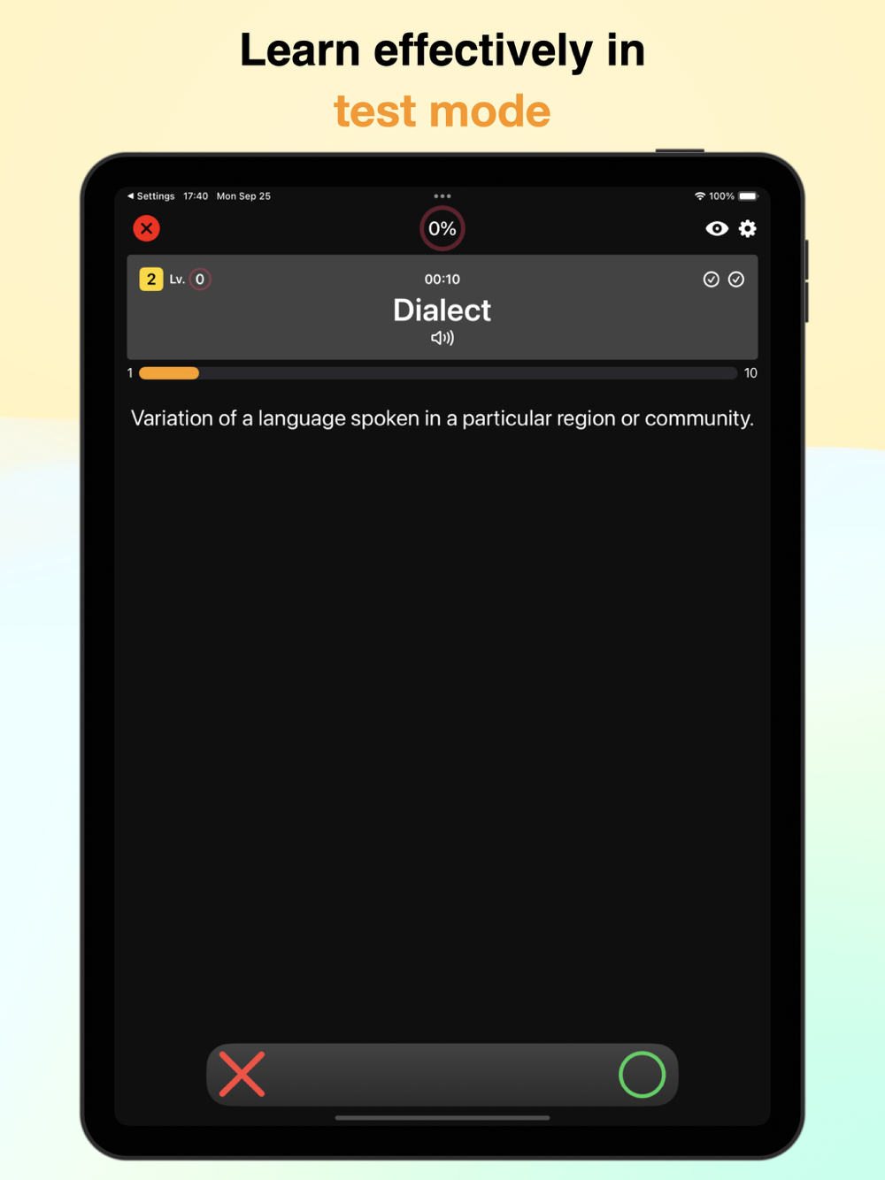 There are three modes: Choice Mode, Typing Mode, and Test Mode. You can change them according to your learning progress and preferences.