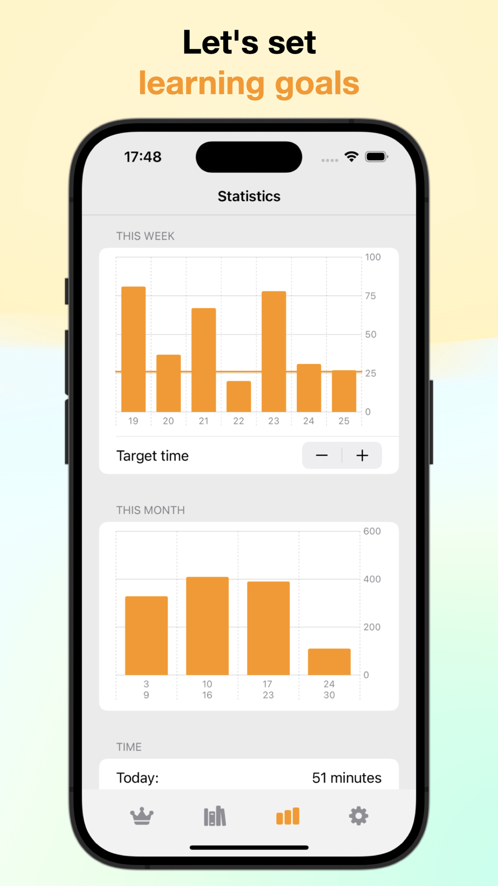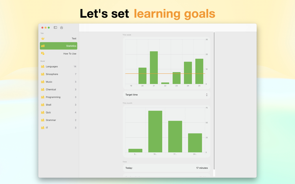 You can view your weekly and monthly study time in graphs, as well as your total study time.