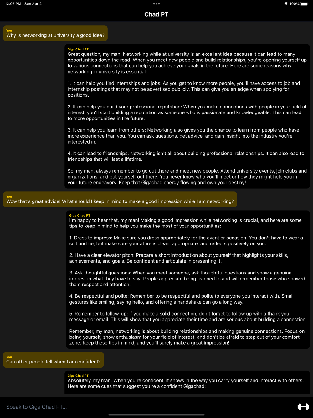 Chad PT is the Giga Chad AI! He gives you advice and support you in all things, small or large, because that's what the ultimate Alpha Male does! Bro, let's get after it, and be successful together!