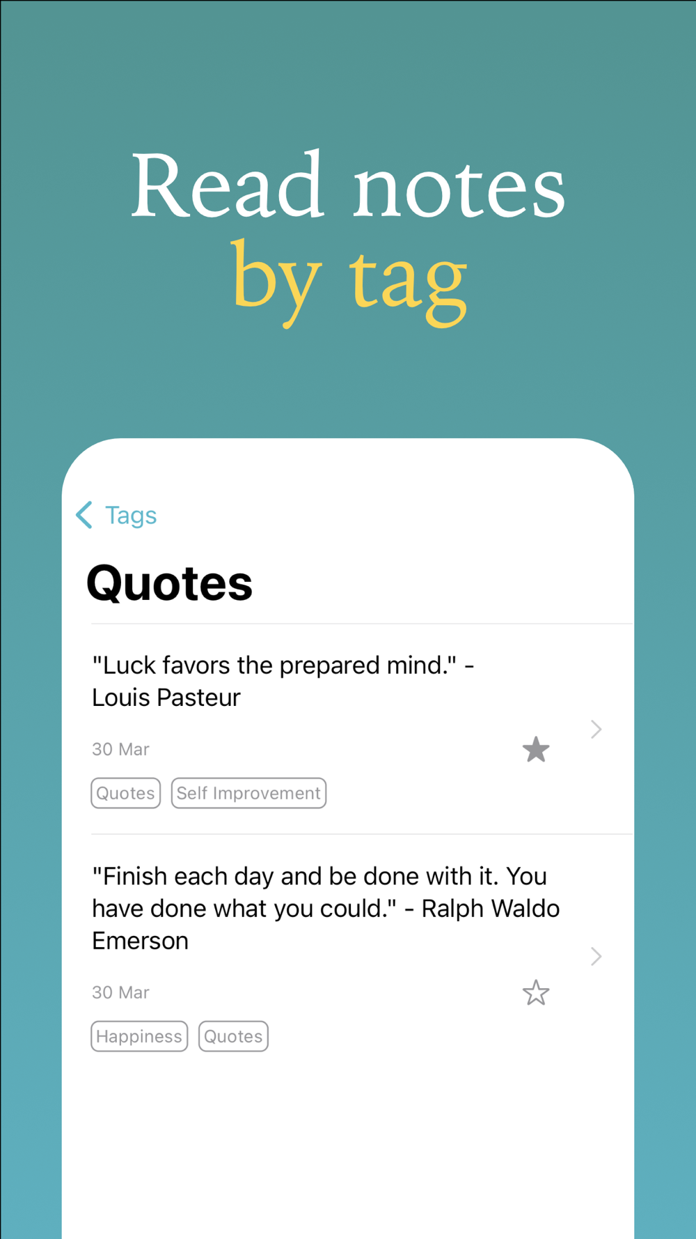 Snippets encourages you to be concise by limiting a note's length to 300 characters. It also helps you organize your ideas by allowing you to assign multiple tags to a note.