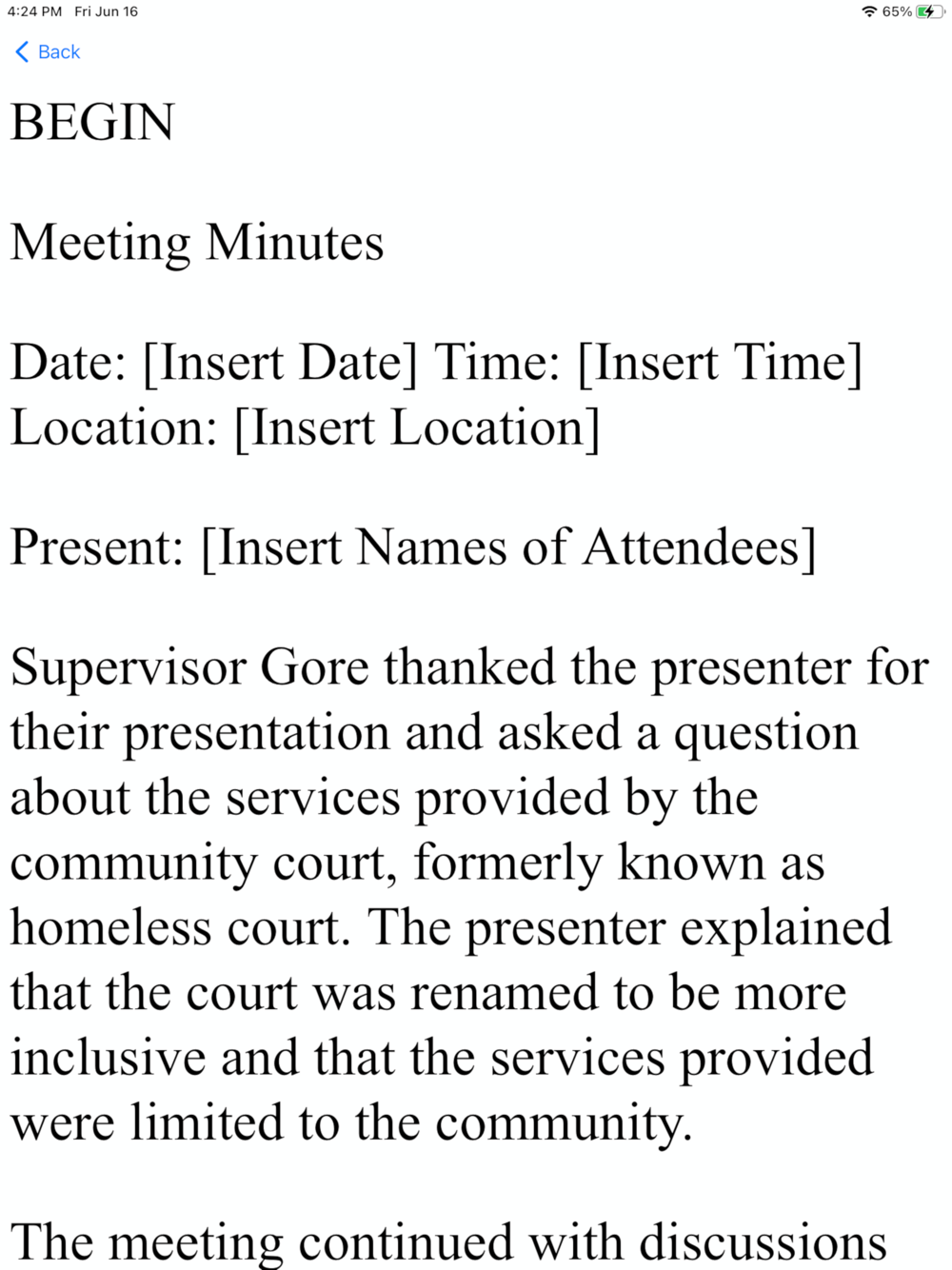 Introducing PromptMinutes: The ultimate meeting summary app for iOS. Seamlessly record and transcribe audio, capturing every detail with near-perfect accuracy. Say goodbye to manual note-taking and let PromptMinutes do the work for you. It intelligently generates concise and comprehensive meeting summaries from the transcribed audio, saving you time and effort. Whether you're a Common Interest Developments managing monthly meetings, a board member of a public company, or simply someone who wants to stay organized, PromptMinutes is your go-to solution. Stay on top of important discussions, extract key insights, and easily share meeting minutes with colleagues or team members. Maximize productivity and make every meeting count with PromptMinutes. Download now and experience the future of efficient meeting management.