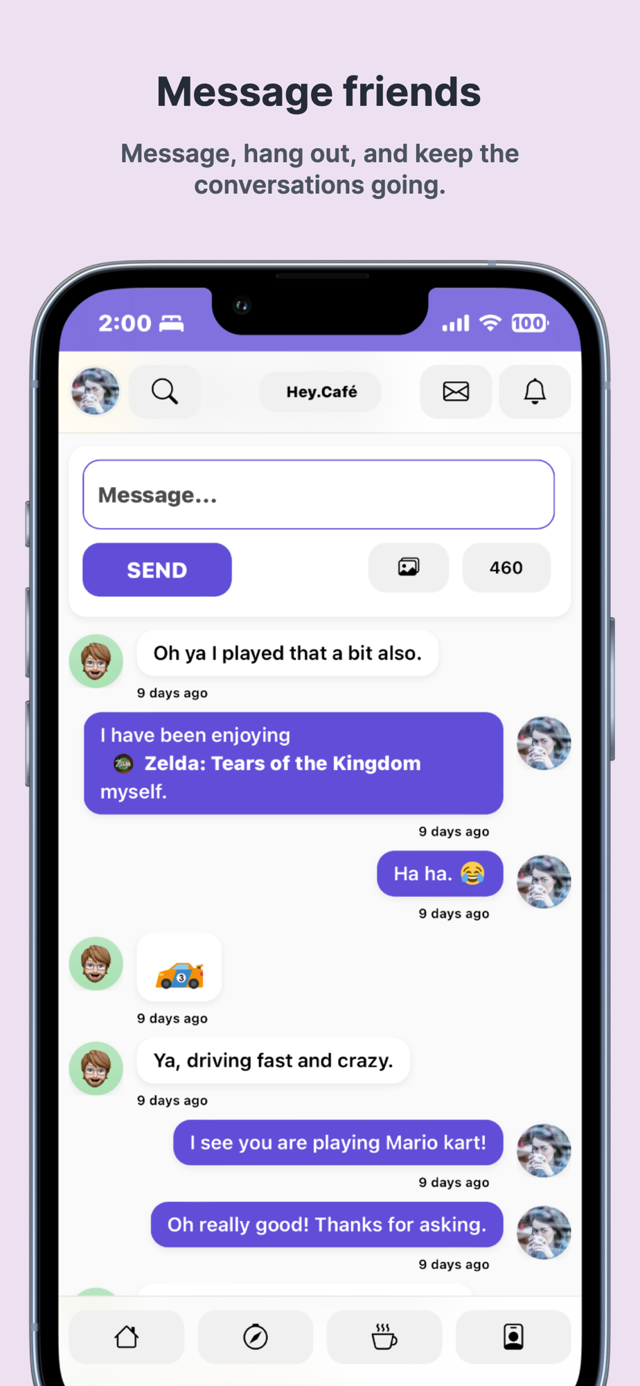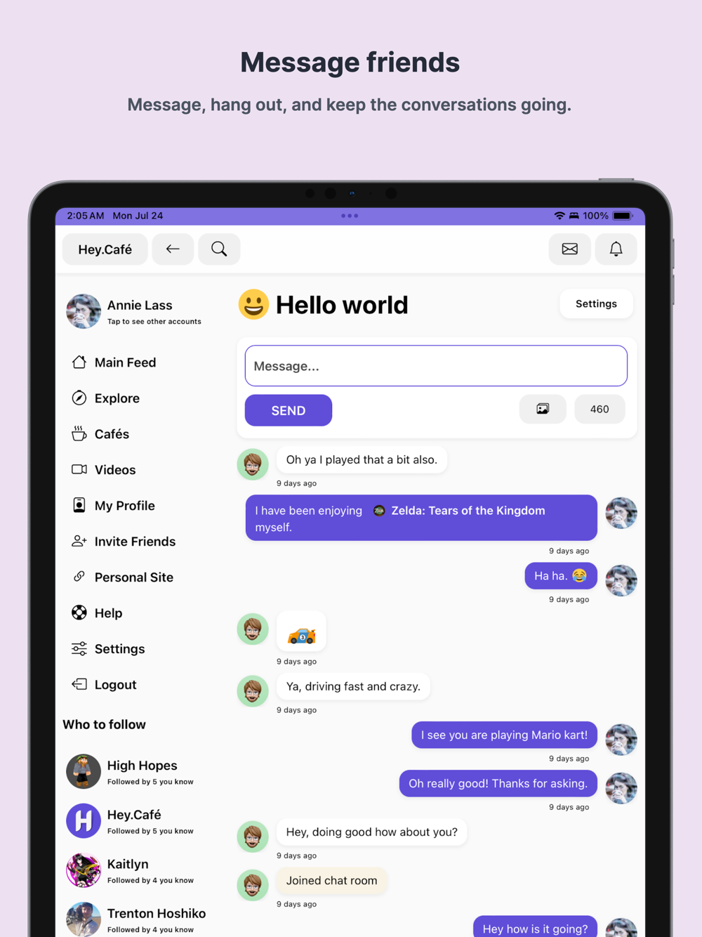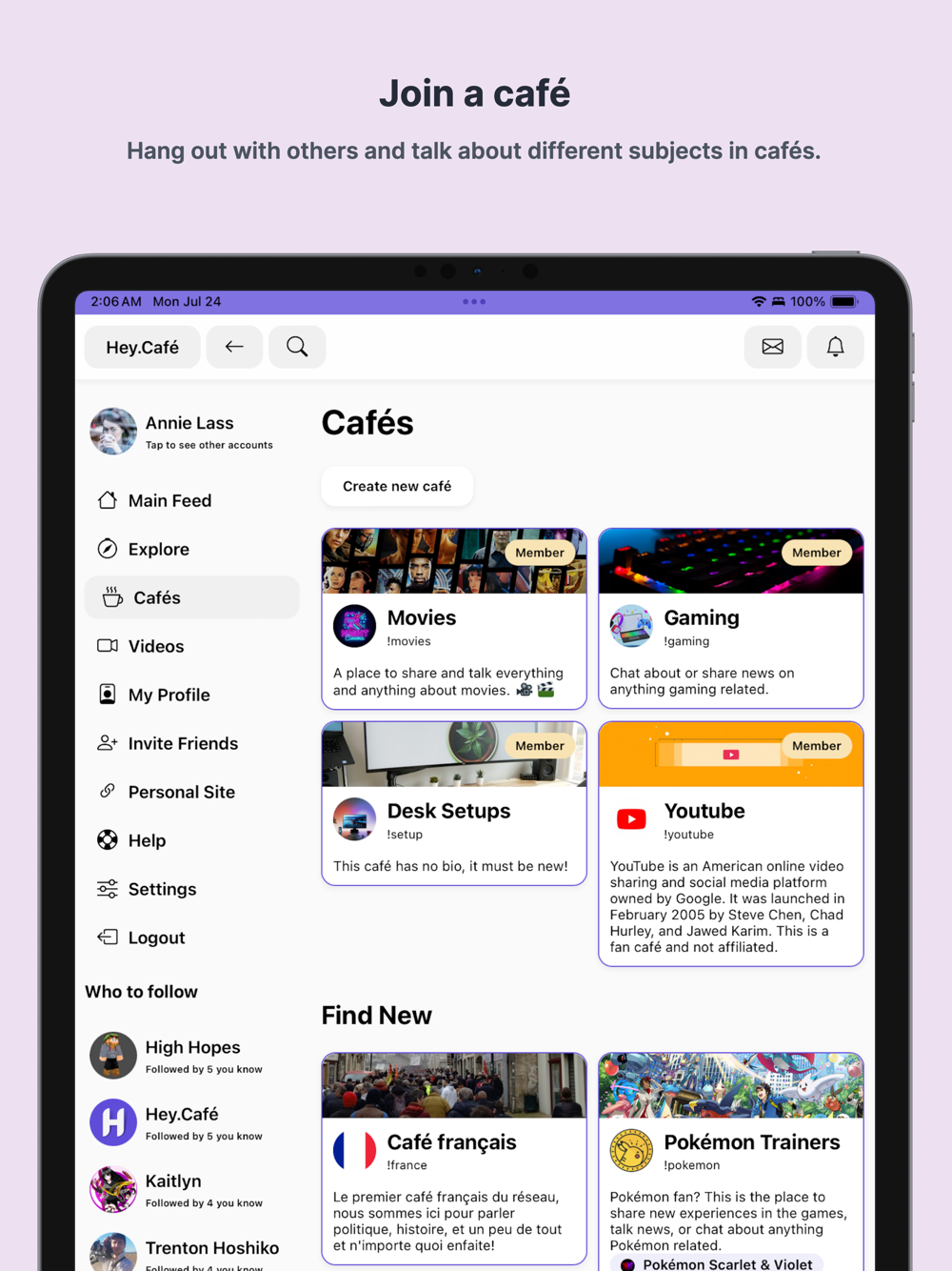 Hey.Café is a new social network designed to be easy to use. When you join you can create new conversations and join communities that we call cafés based on your interests, and it's free to use.