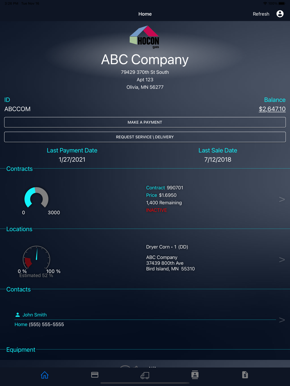 Information at your fingertips! This app gives you direct access to your account balance, location and contract information. It also gives you the ability to store and process payment and request service work and deliveries directly through the app.