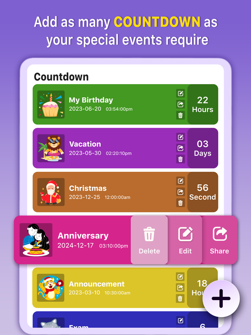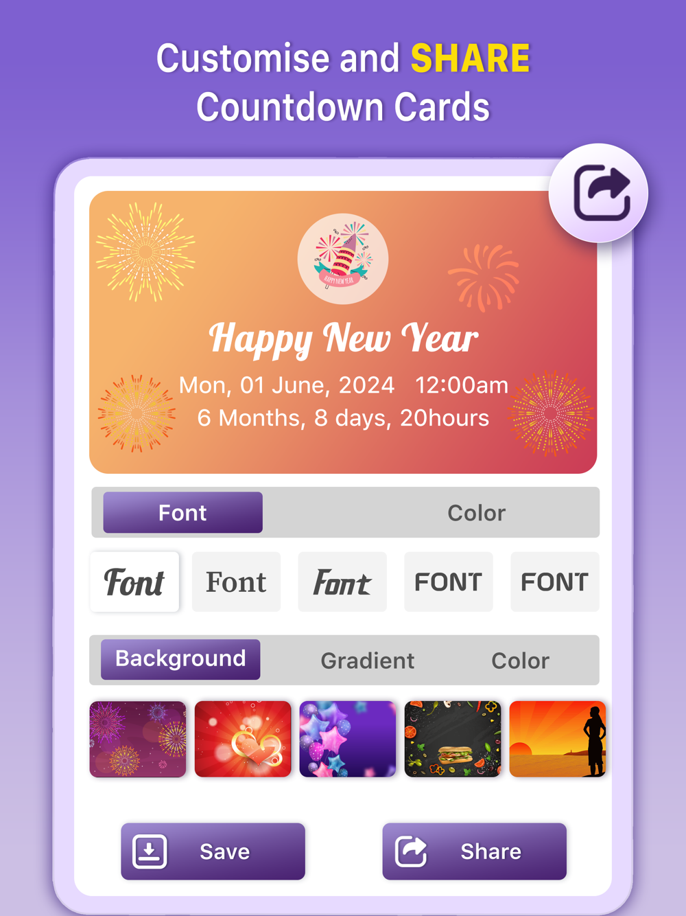• Share your upcoming countdown event with your loved ones on social media and Save to your Photos.
