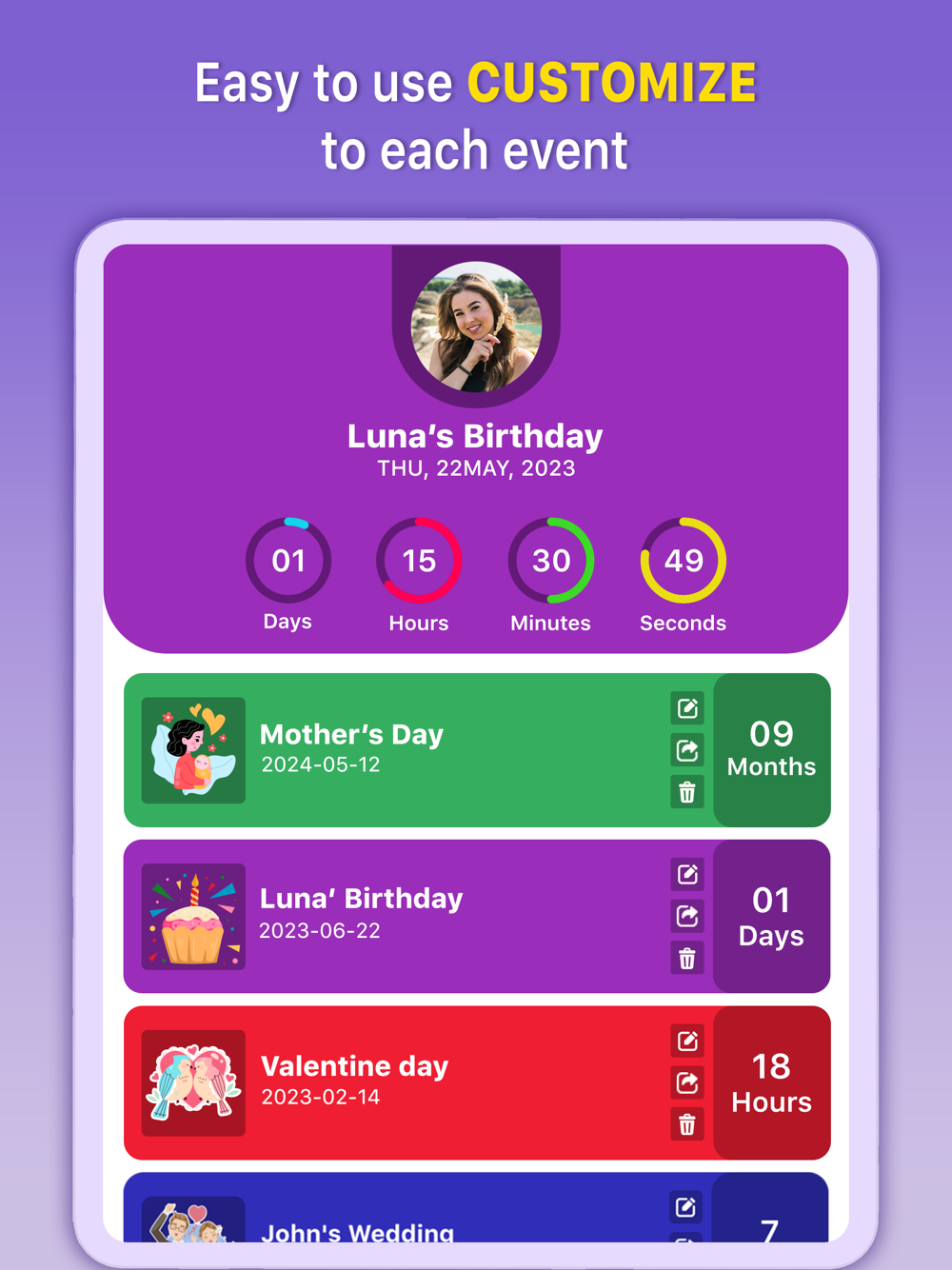 • Customize to each countdown with event related backgrounds, fonts, colors, icon & Countdown display.