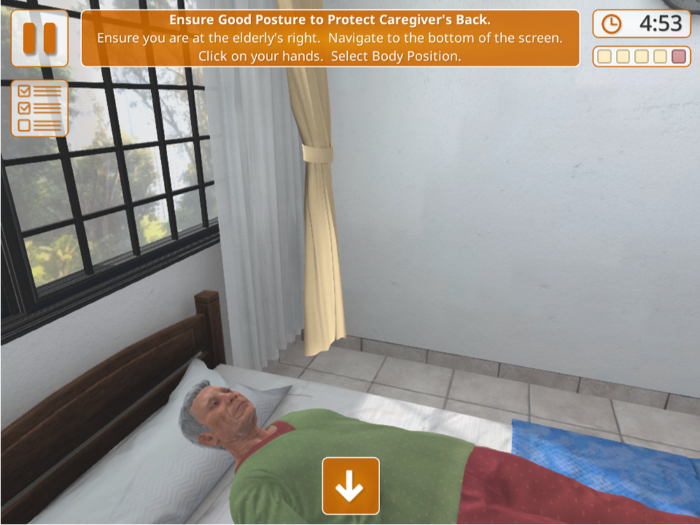 The player will learn the steps in helping the care-recipient change sleeping positions within a virtual home setting, having them lie in the supine, lateral and sims positions at the recommended 2-hourly intervals.