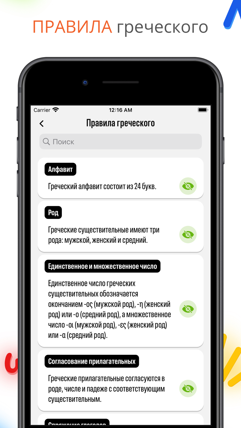 И это еще не все! У нас также есть слова для повторения, игры с разными словами и даже тёмный режим, если вы захотите учить греческий ночью.