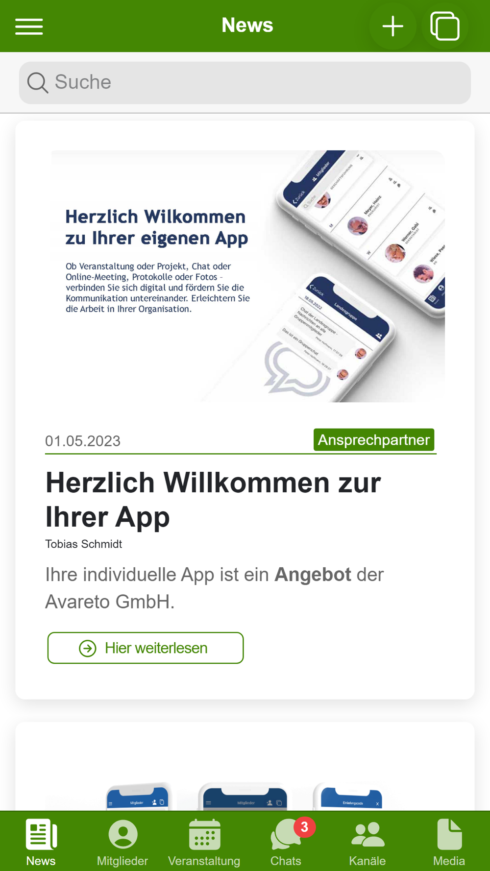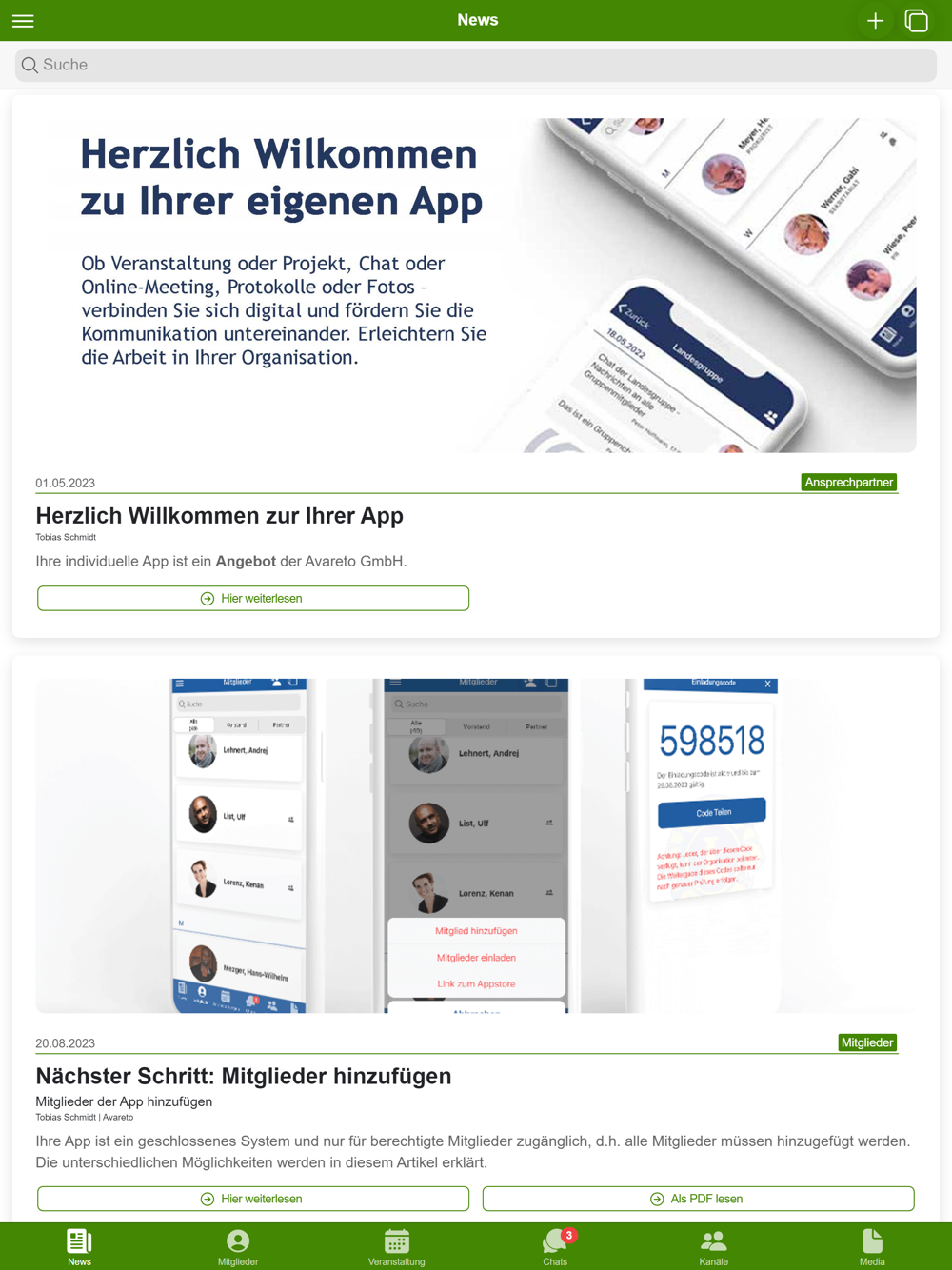 Organisieren Sie Ihr Unternehmen vollumfänglich digital: Kommunikation von Neuigkeiten und Zeitschriften, Verwaltung aller Mitarbeiterdaten, Erstellung von Projektgruppen, Organisation von Veranstaltungen mit Zu- und Absagen, Einzel-, Gruppen und Organisations-Chat, Bereitstellung von Dokumenten, öffentliche Fotopinnwand und vieles mehr ...
