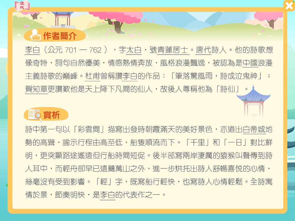 配合教育局文言經典篇章,提供相關的AR素材,展現古詩的意境,讓學生感受古詩文之美。此應用程式專為現代小學中國語文的用戶所提供。