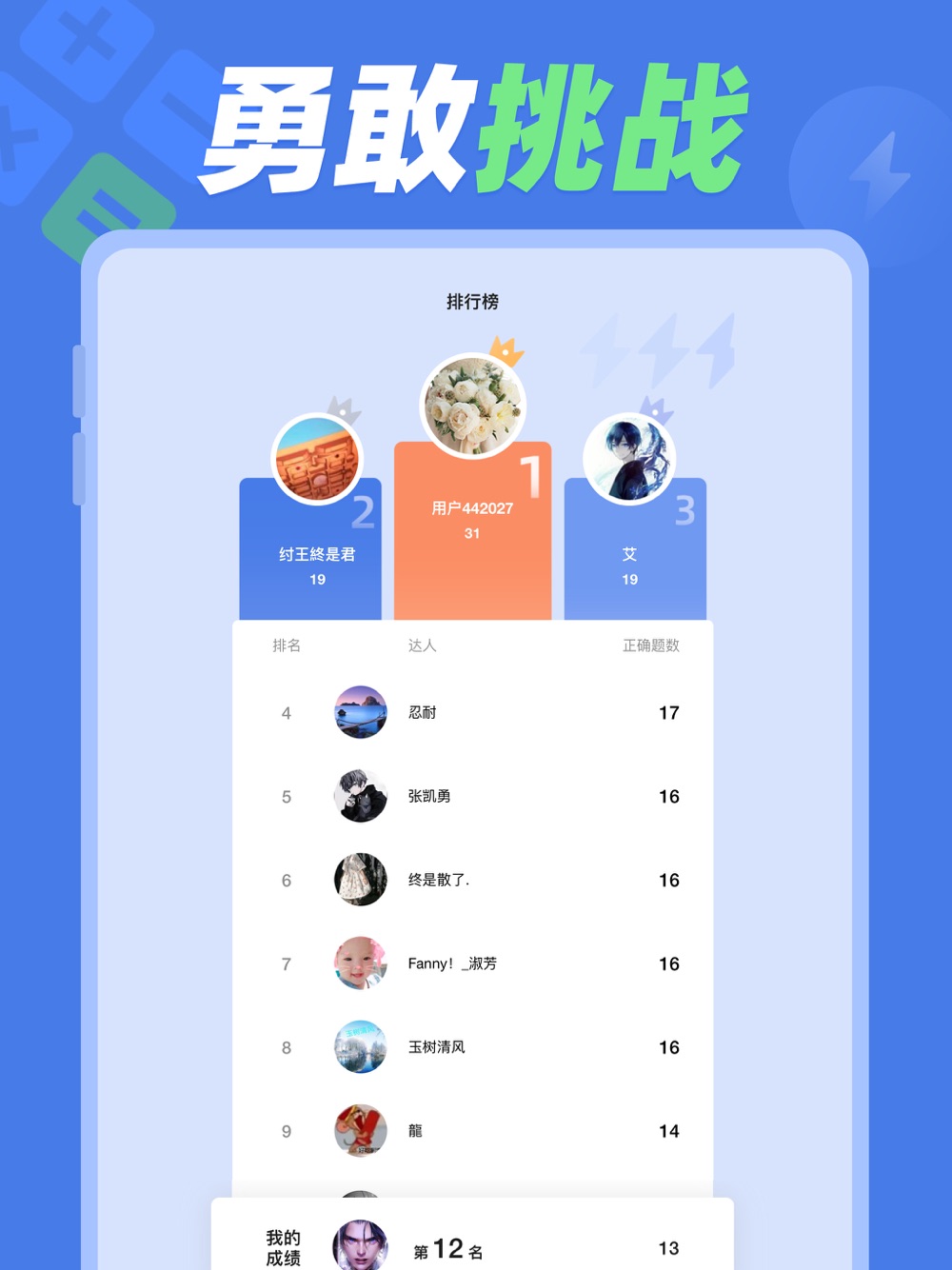 【每日一练】看看再规定时间内,谁能答对更多的题,该模块设置了排行榜,用户可以看看自己的计算水平排在什么位置。