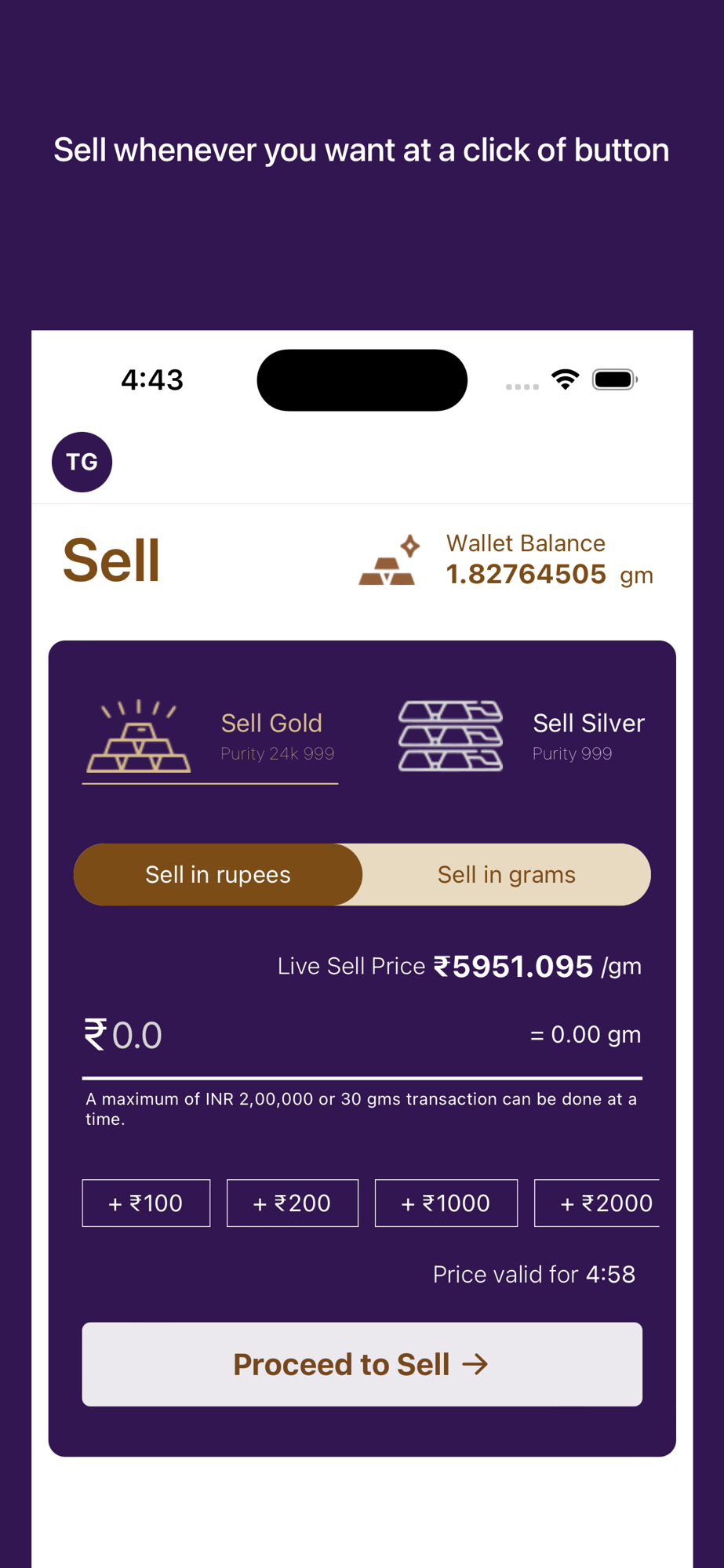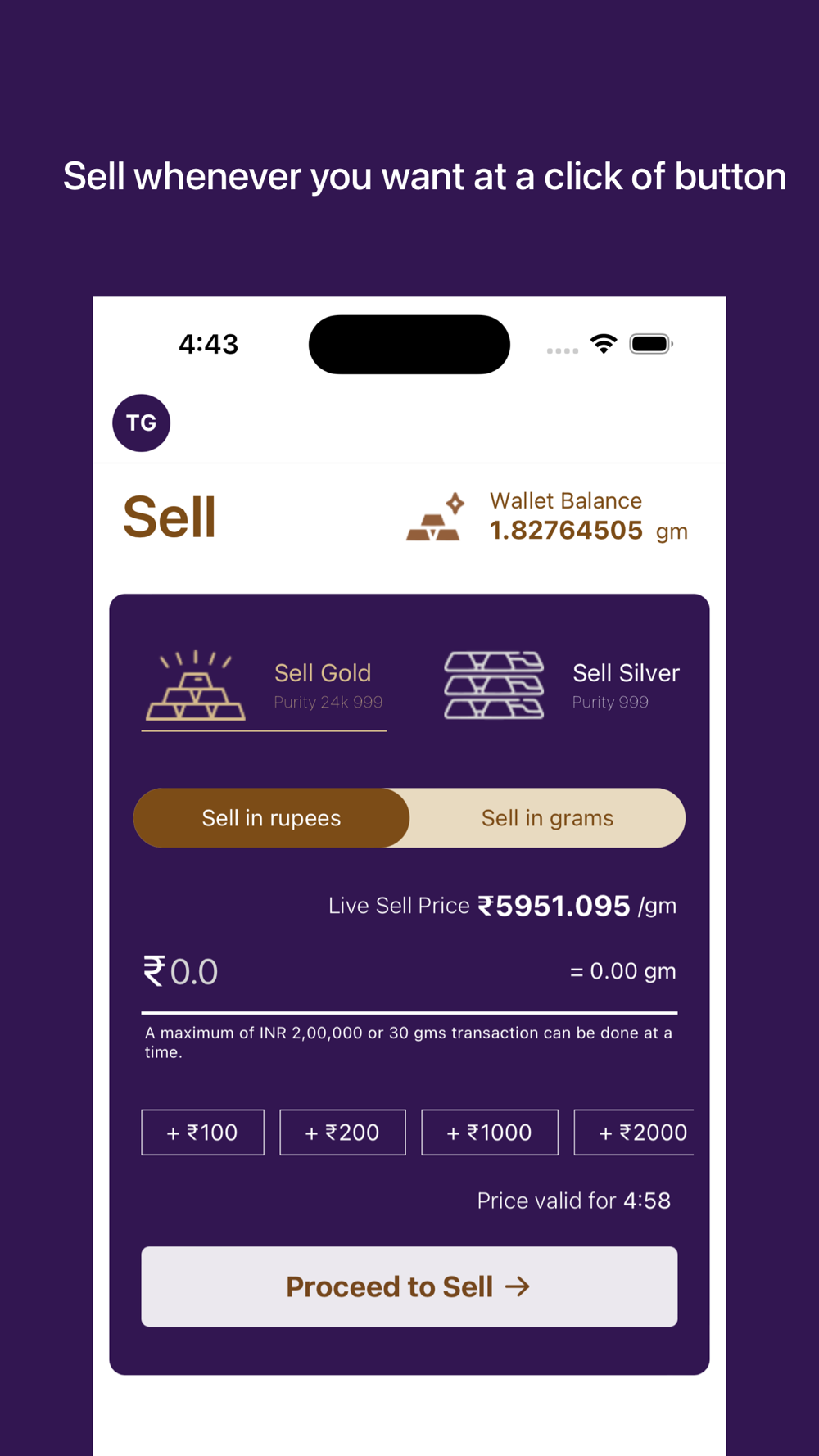 Sell your digital metal holdings at a click of a button anytime, anywhere and get quick cash credit in your account