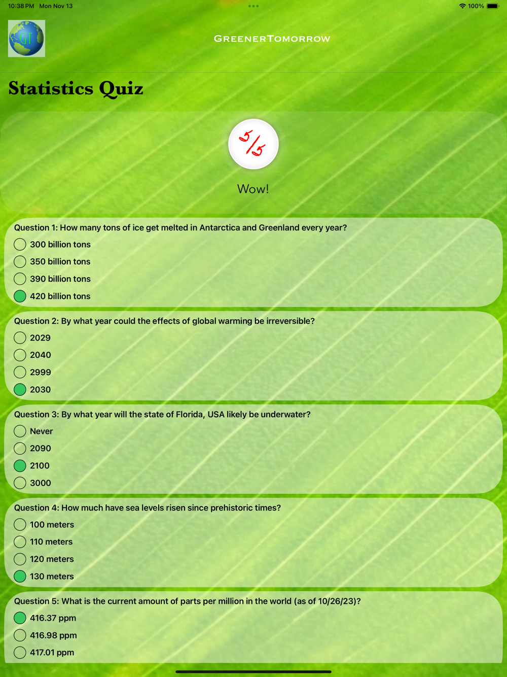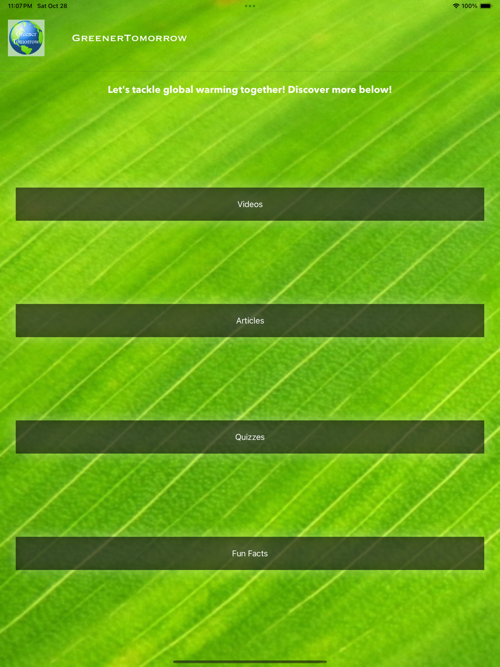 GreenerTomorrow is a free app you can install to learn about one of the most pressing problems in the entire world! In ClimateChanger, you can do four things: Take short quizzes to see how much you know about global warming, watch videos to get a better understanding, read articles to understand more about global warming (coming soon), and even randomly generate a fun fact about global warming from our database of fun facts.