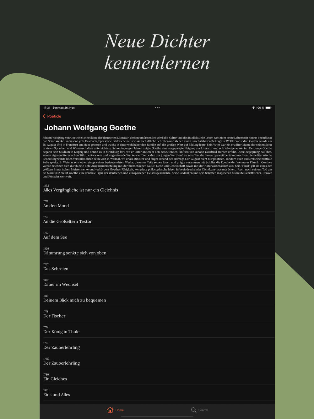 Umfangreiche Gedichtsammlung: Unsere App beinhaltet eine vielfältige Sammlung von Gedichten aus verschiedenen Epochen und Stilrichtungen. Von den Klassikern der Weltliteratur bis hin zu modernen und zeitgenössischen Dichtern – Poeticle bietet eine breite Palette an poetischen Werken, die sowohl für Bildungszwecke als auch zur persönlichen Bereicherung genutzt werden können.