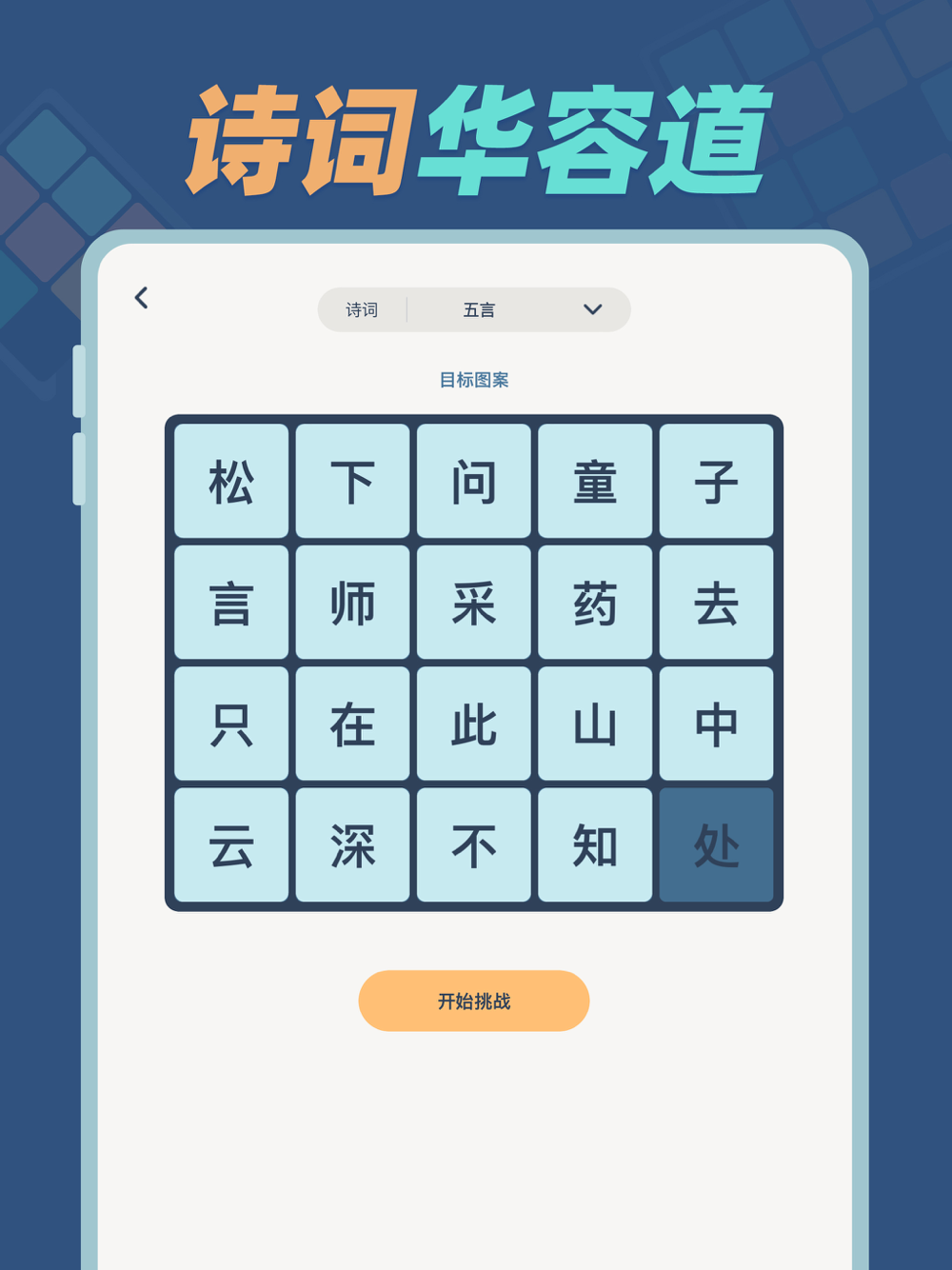 【诗词华容道】设置了五言和七言2个难度,通过移动字块将迷盘里的字连成正确的古诗,在训练过程中也可以查看古诗,该玩法既掌握了古诗,又锻炼了逻辑;