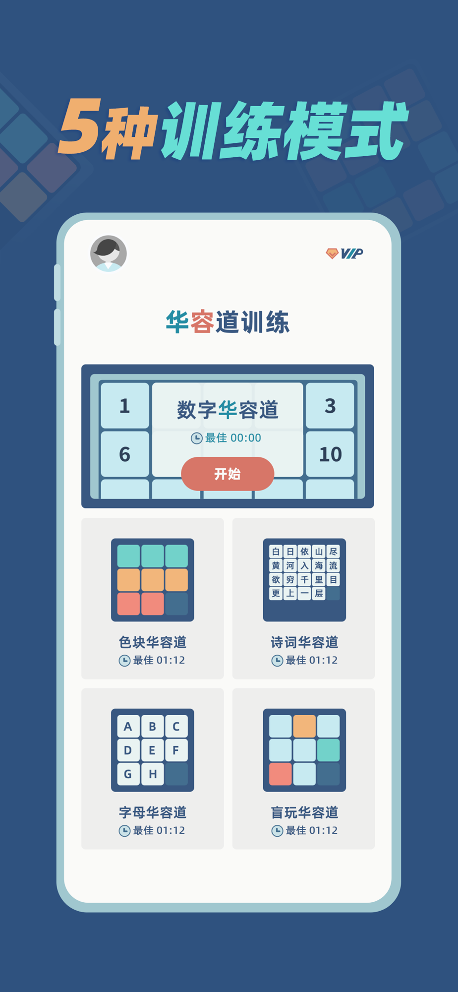 【盲玩华容道】设置了6个难度,开始训练后迷盘翻面,用户需要通过记忆进行排序,该玩法主要锻炼用户的记忆力,同时也锻炼了逻辑力。