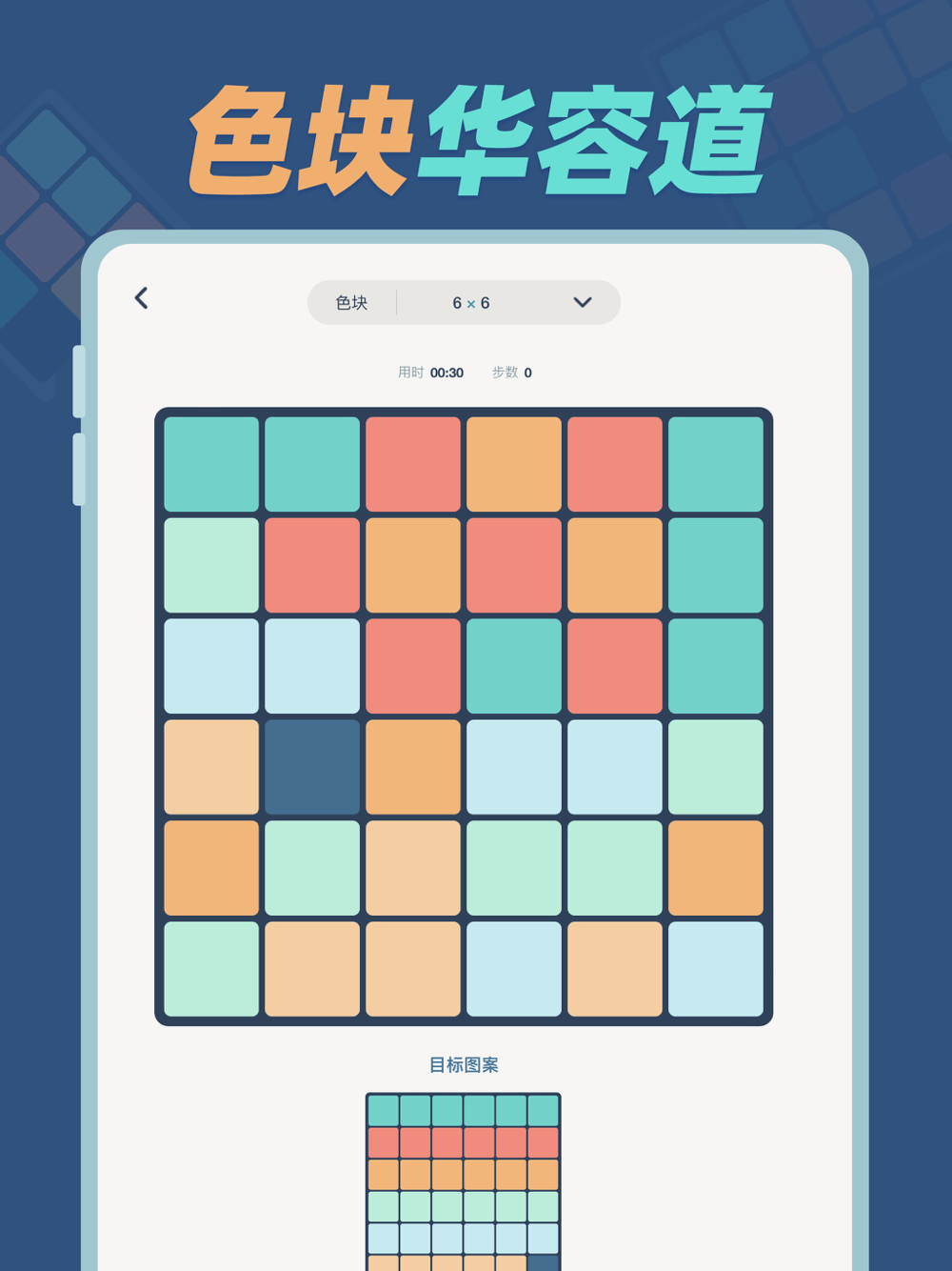 【色块华容道】设置了6个难度,通过移动色块将迷盘按照目标图案进行排序;