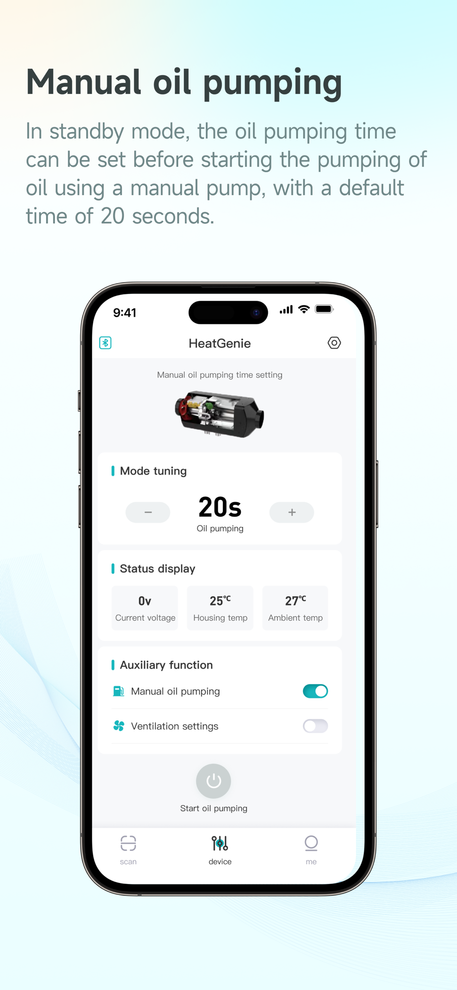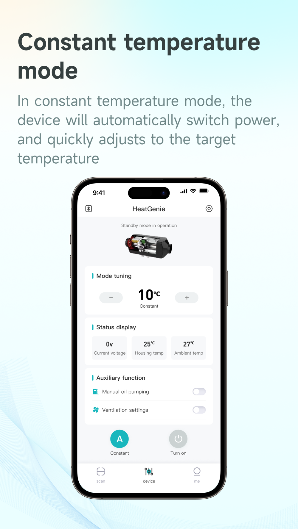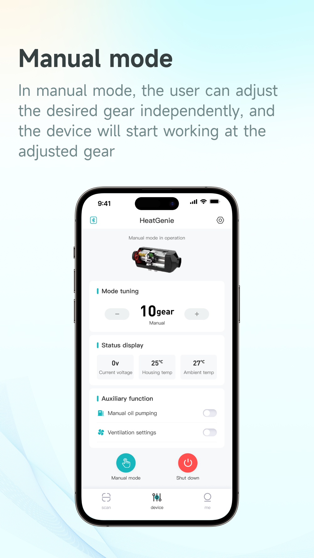 HeatGenie connects to smart hardware products through Bluetooth on your mobile phone, allowing you to easily control the parking diesel heater through the mobile app, complete operations such as adjusting the temperature, switching gears, and turning the machine on and off.