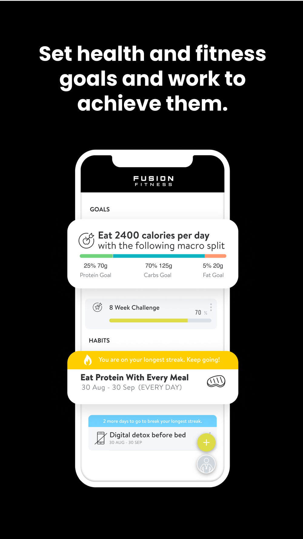 With the Fusion Fitness PT App, you will have access to workout programs designed specifically to help you reach your fitness and health goals! You can follow & track your workouts, your nutrition, your lifestyle habits, measurements and results–all with the help of your coach.