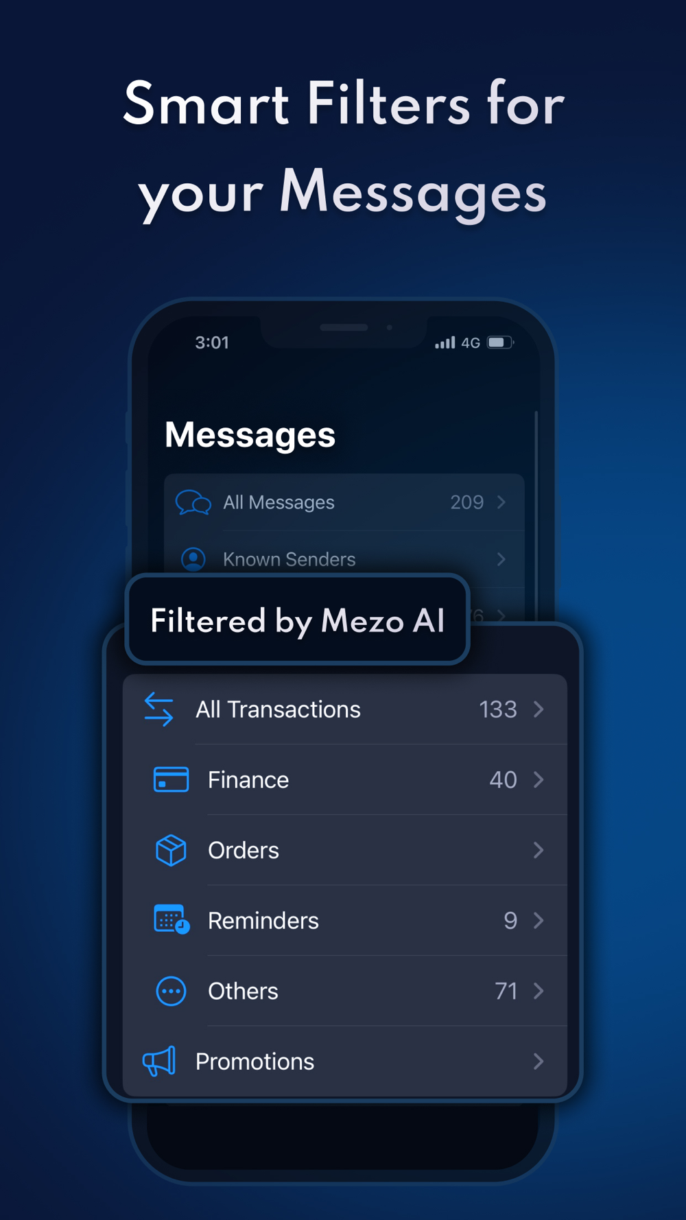 Mezo AI is a privacy-focused SMS Spam Filter & smart SMS organizer for your iPhone's Messages app.