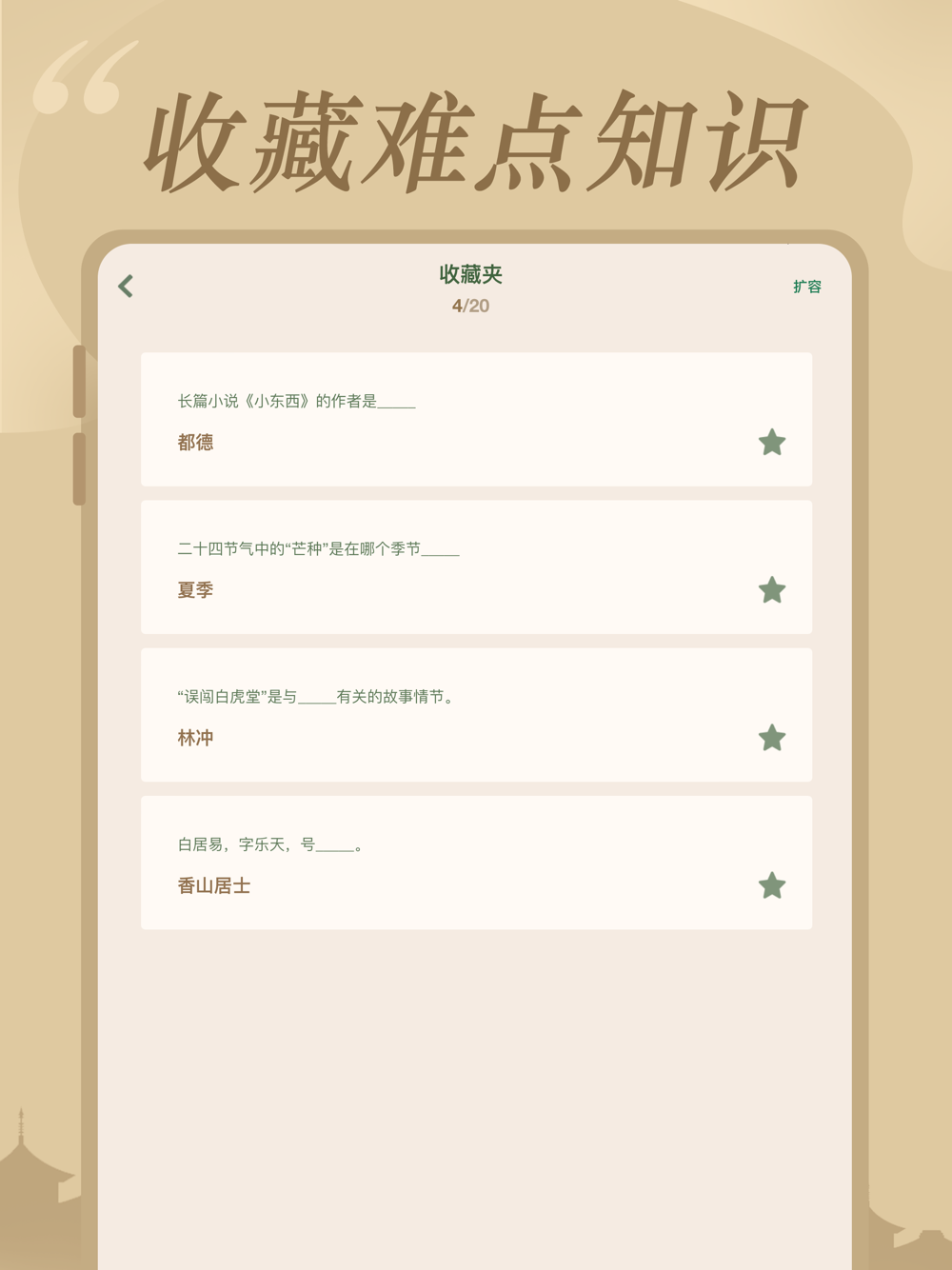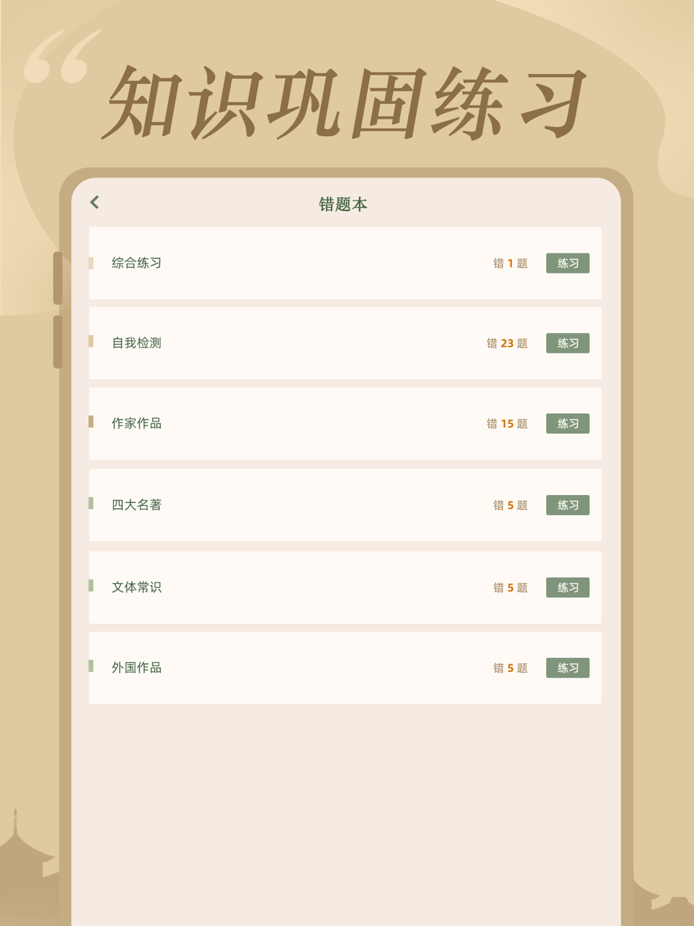 本软件对文学常识做了五大分类:四大名著、古今名家、民间故事、古代文化、外国文学,可以帮助用户更好更清楚的对各方面的文学常识进行针对性练习。